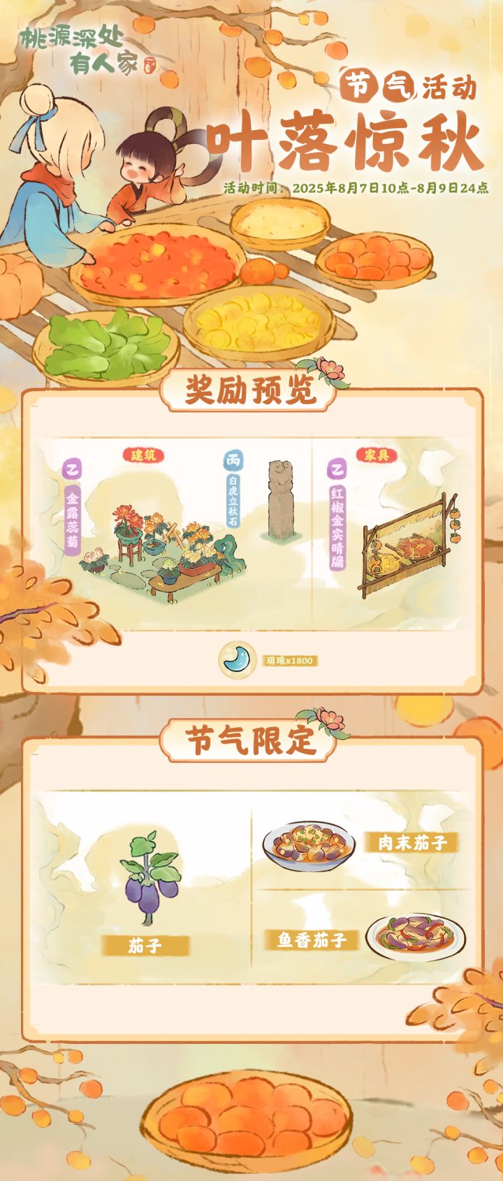各位萝萝山山民好呀!四立之一的立秋节气要来萝~ 立秋虽至,暑热却未完全退场,山民们仍要注意防暑降温萝!今日小花整理了一份立秋节气活动预告,感兴趣的山民可别错过啦!活动名称:叶落惊秋活动时间:2025年8月7日- 2025年8月9日 活动期间,山民们可以种植节气农作物「茄子」,用新鲜收成制作两道美味节气菜品 「肉末茄子」和「鱼香茄子」,尝尝秋日里的鲜嫩滋味吧~另外,装饰商店将上新秋季家居套装