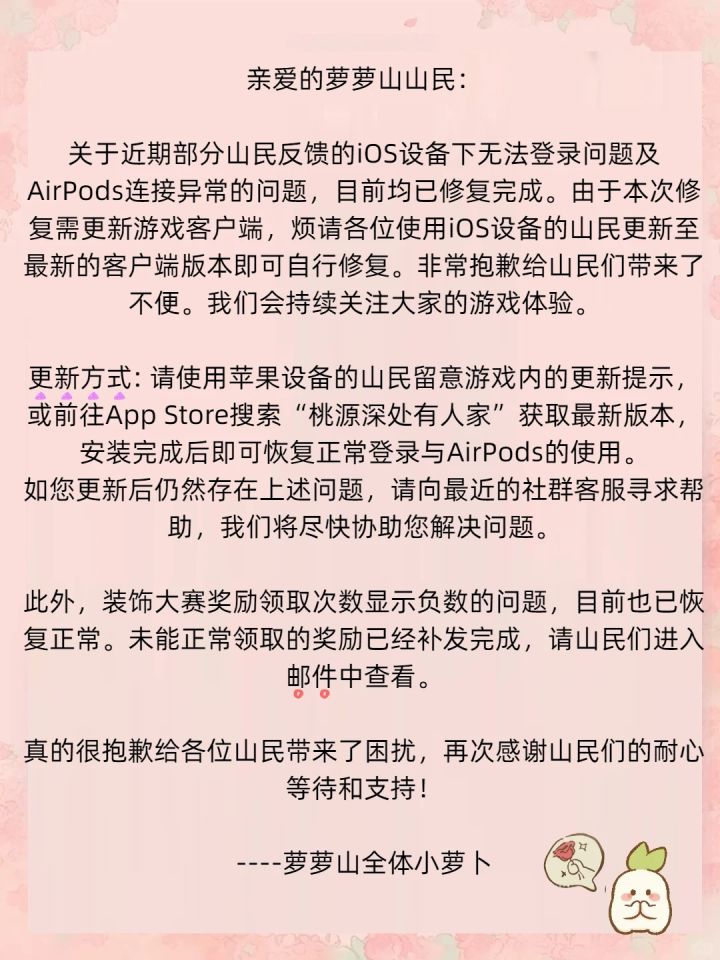 亲爱的萝萝山山民:关于近期部分山民反馈的iOS设备下无法登录问题及AirPods连接异常的问题,目前均已修复完成。由于本次修复需更新游戏客户端,烦请各位使用iOS设备的山民更新至最新的客户端版本即可自行修复。非常抱歉给山民们带来了不便。我们会持续关注大家的游戏体验。更新方式: 请使用苹果设备的山民留意游戏内的更新提示,或前往App Store搜索“桃源深处有人家”获取最新版本,安装完成后即可恢