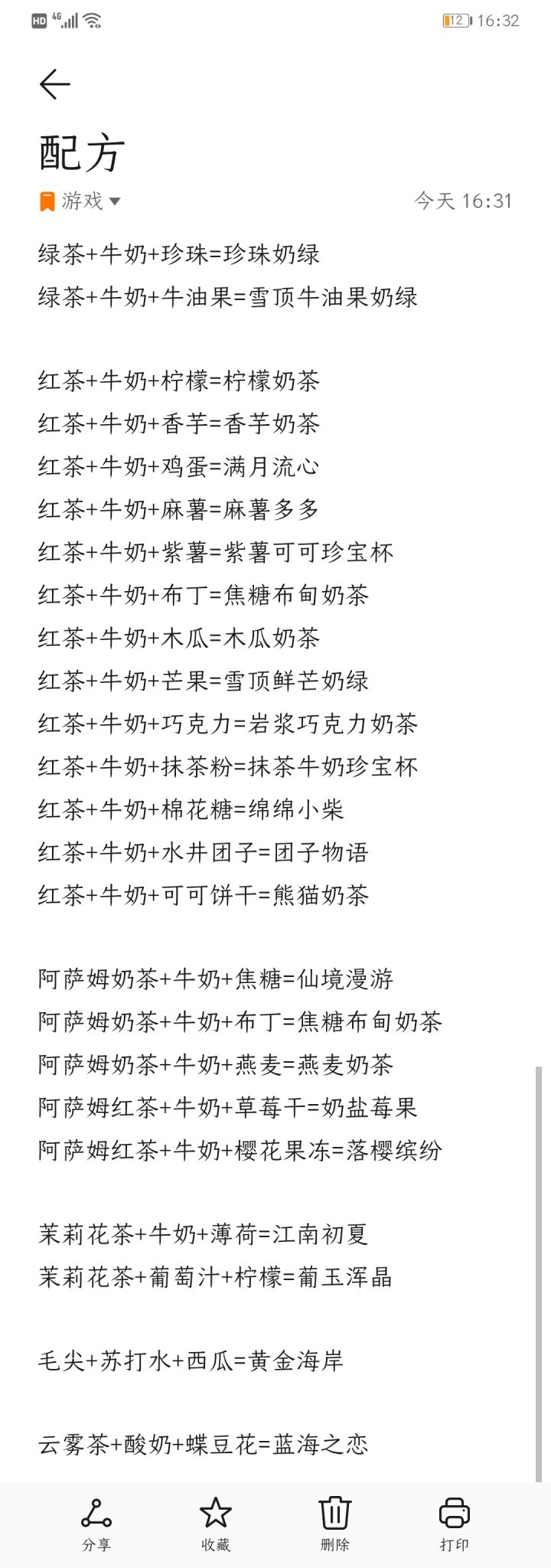 现在随着大家获取越来越多的材料,女王特地整理了一些特殊奶茶的配方,在这里公布给大家: