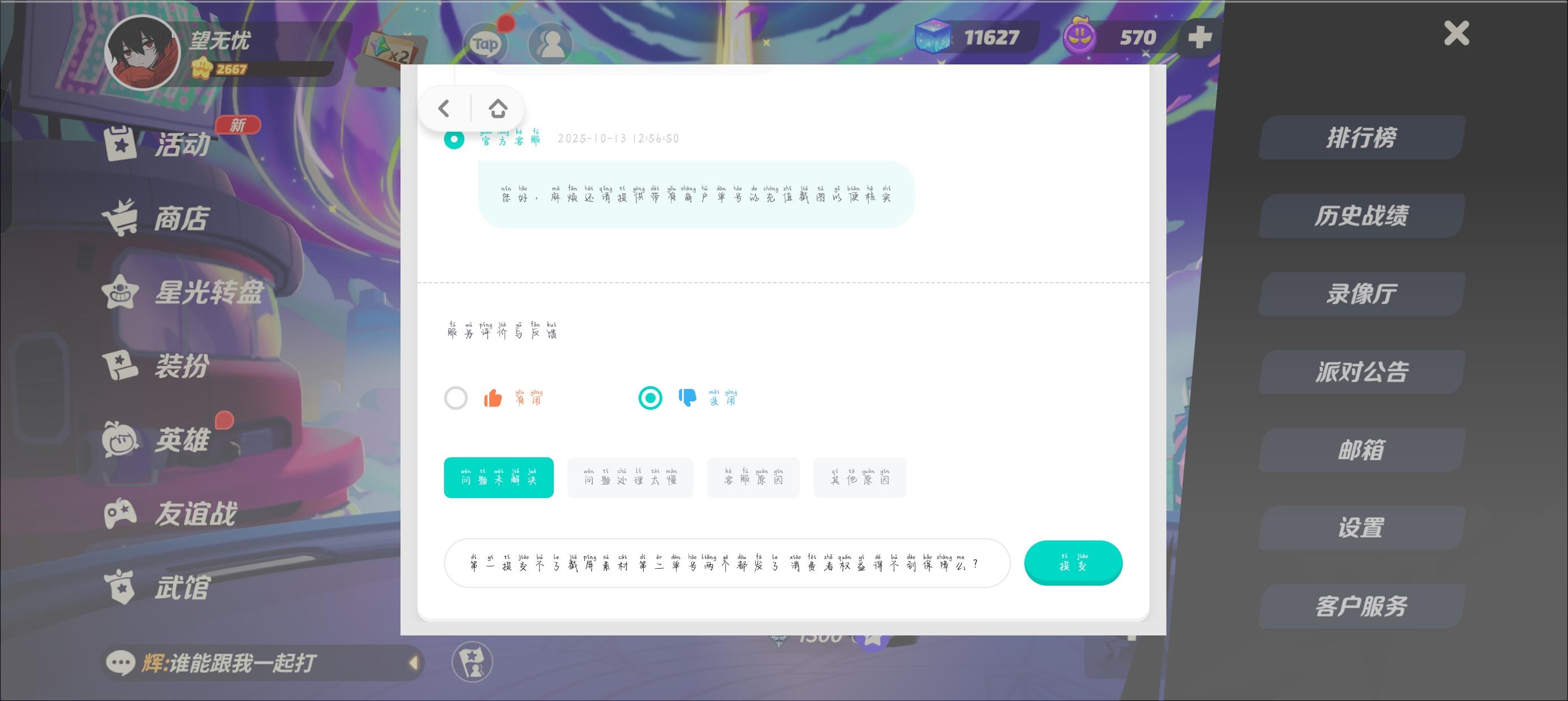 打的打的时候不得了的,卡人物都动不了,跟客服申诉,客服说让我上传视频。点上传视频直接闪退,上传视频的界面都进不去,垃圾游戏。