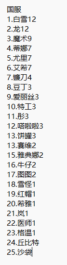 国服1.白雪122.龙123.魔术94.蒂娜75.尤里76.艾希77.镰刀48.豆丁39.爱丽丝310.特工311.彤312.嗒啦啦313.饼罐313.赛维215.雅典娜216.牛仔217.图图218.雪怪119.红帽120.希雅121.岚122.医师123.格温124.丘比特25.沙袋