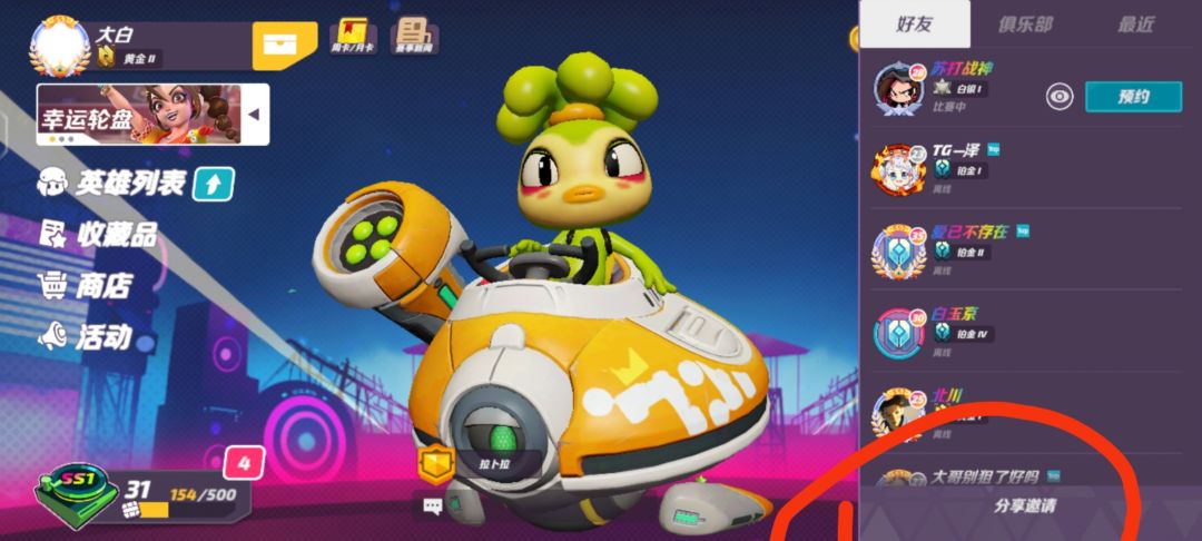 6.20派对星tap动态👇🏻 主页面右上角→TapTap动态(点进去好像得加载完再返回才算) 6.17派对星社交分享👇🏻 点左上角头像→进入个人主页→点右下角分享按钮→点更多→最后返回就可以了~ 每日的分享任务也可以这样做👇🏻 主界面好友组队右下角以及对局数据右上角都是有分享按钮的,反正游戏内任何分享都是属于社交分享,帖子仅供参考~ 注:这个分享有bug,直接分享出去不一定有算的,如果不行,再试试