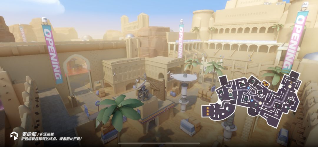 选手们好,今天我们来到火力苏打的5v5赛场:麦地那! 【地图规则】-护送运载 随机分配攻守方;蓝色为进攻方,先抢占据点,然后护送运载目标到达终点,获得胜利!红色为防守方,比赛时间结束时,成功阻止运载目标到达终点,获得胜利! 【地图场景】 麦地那,历史悠久的沙漠小镇,位于荒漠峡谷;镇内房舍沿蜿蜒小巷错落,镇外由壮丽的峡谷环绕。 【地图风貌】 麦地那曲折蜿蜒,拥有多样的掩体和战略高地,使其成为一个具有