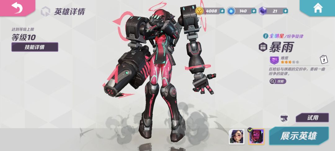 T0:暂无 T0.5:暴雨 (最强输出)超高的弹容量和极快射速让她在护送运载防守时尽显光彩。就是她的输出太依赖奶和盾,所以对局时怎么办不用我说了吧。 T1:斯嘉蒂,格罗丽亚(游骑兵),克里斯蒂娜(红辣椒),风间隼,贾巴里,亨特,暗枭,裁决。 斯嘉蒂:他是一个高爆发型英雄,被动最高爆头4200伤害,是输出的优选之一 格罗利亚(游骑兵)经历过两次改版后生命从5600—5860—6300。有了被动的他让