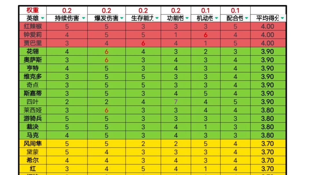 个人拙见,不喜勿喷 叠甲: 黛蒙和莱西娅以及老头都只在训练营玩过,但是作为队友对手都匹配到过,纯印象流。 主要针对钻石大师的平民水平对局。 测试中的二大也考虑在内,如大狙,涯的二大。 评分全靠主观印象。 一、总评级 从六个方面加权平均获得总分,根据总分评级。红色为版本强势,绿色为版本主流,黄色为版本弱势,白色为强度较差。 下面分六个方面做出一些解释说明。 1.持续输出 持续输出参考了DPS,压制能