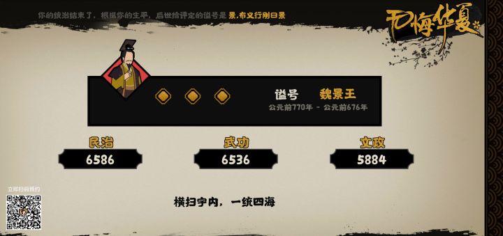 本次测试已经7天了,绝大多数人早就三个主线全部打通,剩下的可能还有部分人想要却并没有达成三星结局。我来告诉大家达成三星结局的条件。先说结论,最终评分达到16,000即可三星结局。评分与民生、军心、腐败和科技有关,科技和各属性全满猜测可达到7500。大家可以携带一些可以刷属性的名臣来达成三星结局。三星结局与是否是统一结局、诸侯咸服结局无关,仅看最终民冶、武功和文政三项评分相加的最终评分。结合我个