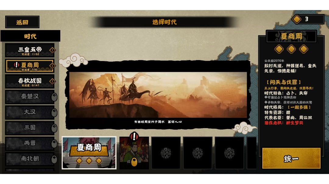 我玩的时候急着玩战国时期,所以三皇五帝和夏商周都是直接平推的很难给到建议,唯一的就是夏商周时期一定要注意腐败,腐败乃一生之敌。还有就是行酒令,对面大概率是有规律的,老虎刺猬农具,农具老虎刺猬这种总之有规律哪怕你是个倒霉蛋前两次都输了把握住规律后面也是可以赢得,极少数不走套路不过也没关系输几次影响不大。战国时期我现在是第三次打,之前一直以为推得快评分就高,第一次赵国有事情一直在挂机八十年推掉两颗星