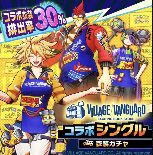 ●各种意义上都应该说是鬼才联动●联动规则基本跟Zone联动一样,单独开一个持续一个月的皮肤池,后续应该有给相关头像的活动任务●联动池抽取规则和普通皮肤池一样,唯一不同的是有30%的概率出现联动衣服,衣服一共有三件,都是junk high成员的上衣,即看板娘,狙妹和机车男●稍微介绍一下Village Vange,是一家在日本比较有名的奇葩书店,说是书店其实更多的是卖一些有趣的杂货,嗯,放某音上