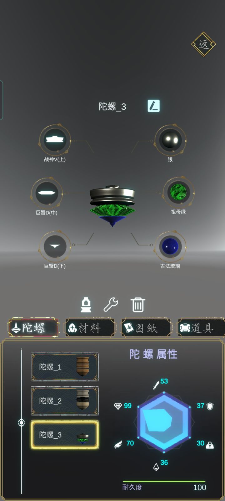 本人前期一直在玩爷爷版陀螺,比较贵的材料都舍不得用,靠三个木头爷爷版打娱乐乱斗刷钱,一局400多,赢了还有宝箱。于是乎,我做了成百上千个爷爷陀螺。但是爷爷版的雕刻工艺已经深深刻在我的脑海里。哪怕是刀锋套的图纸摆在那,我照样可以雕出来爷爷陀螺。完成度还能在90多,各种数值也比排行榜靠前的大佬刀锋差不了多少。昨天下午下线后就没上线了,好想知道是哪个倒霉蛋偷袭我爷爷陀螺,然后被干碎了