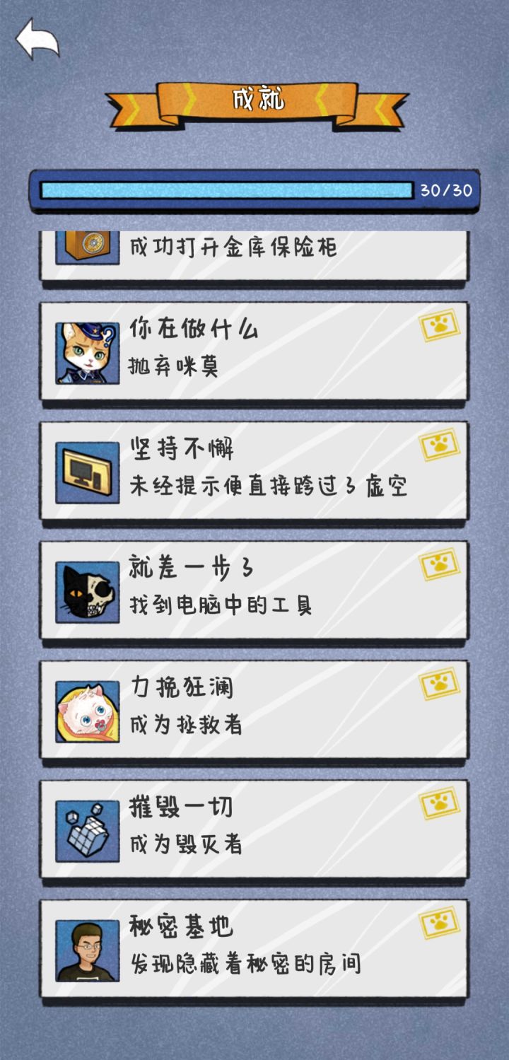 因为熬夜玩,没截图,凭记忆说吧,如有错误欢迎指正。而且没有太注意成就,仅供参考。首先重新进入游戏,修改语言成简中。然后把电视节目里面咪莫的头像移到下面对话框,就能正常对话了。然后去银行,不让进去,把婴儿车里面52号探员的脸部拼图拼好,获得大门图纸。通过移动视角使得大门图纸展开正好和实际柱子重合,就可以将消失的大门重新出现。进去发现柜员机的猫按钮没了,去弹簧老鼠那里,摇晃手机来实现老鼠晃动