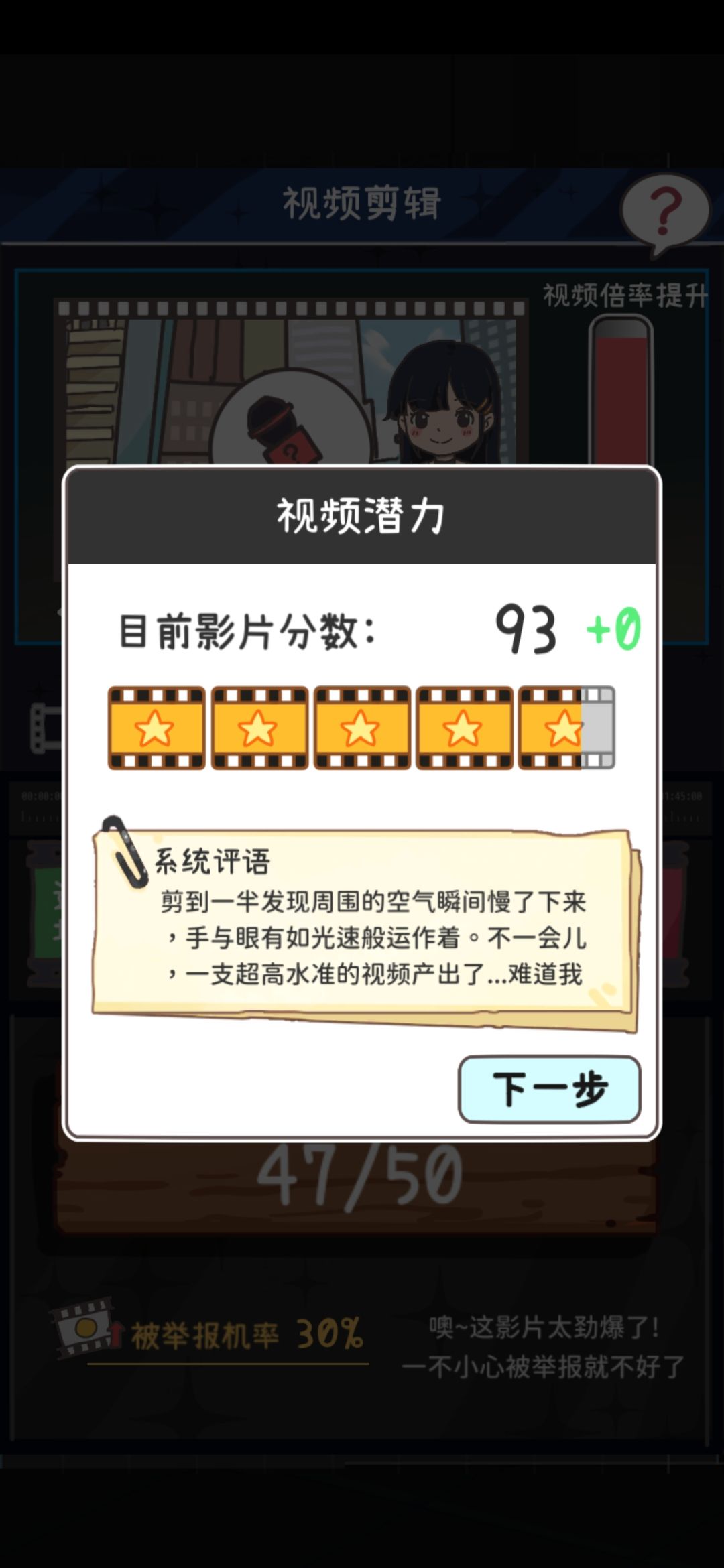 关于题材选择 上面的帖子有大佬们提供旷世题材的攻略,强推,是前期片子高分高金币高关注的方法! 题材专精一个或者两个题材就好。我是疯狂,料理,家中和可爱,料理,家中这两个视频题材制作轮着切。然后最后的视频剪辑一定要升级满级可以剪8次。 关于视频剪辑 一定要升满级。 分数是这样排列的 (按三连算分)劲爆 4分>良好 3分>过场 1分 (按四连算分)劲爆 5分>良好 4分>过场 2分 关于最后一个行动点