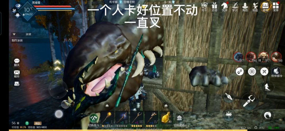 1×3的困龙房,2层的墙。 驯服科多兽,主要是叉它的头。一定距离下(如视频)它攻击不到人,一个人卡住这个位置不动,作为另一个人种草回来卡位的参照物,这是关键,可以节省很多重新卡位的时间。 这时,就可以开始投入驯服工作了。一个人不间断地叉,不动;另一个人负责种草、吸引仇恨、叉。 一段时间科多兽会翻滚,这时可能叉不到,但是频率不高,不用担心。另外它可能会转身,负责种草的那个人就要上去叉它屁股让它转过来,然后再继续以上程序。 方法简单,无伤,重要的是麻醉药剂、耐力药水、近战武器修理包要带够。 最后,祝大家轻松驯服科多兽,也希望大家不要去攻击别人正在驯服的生物。