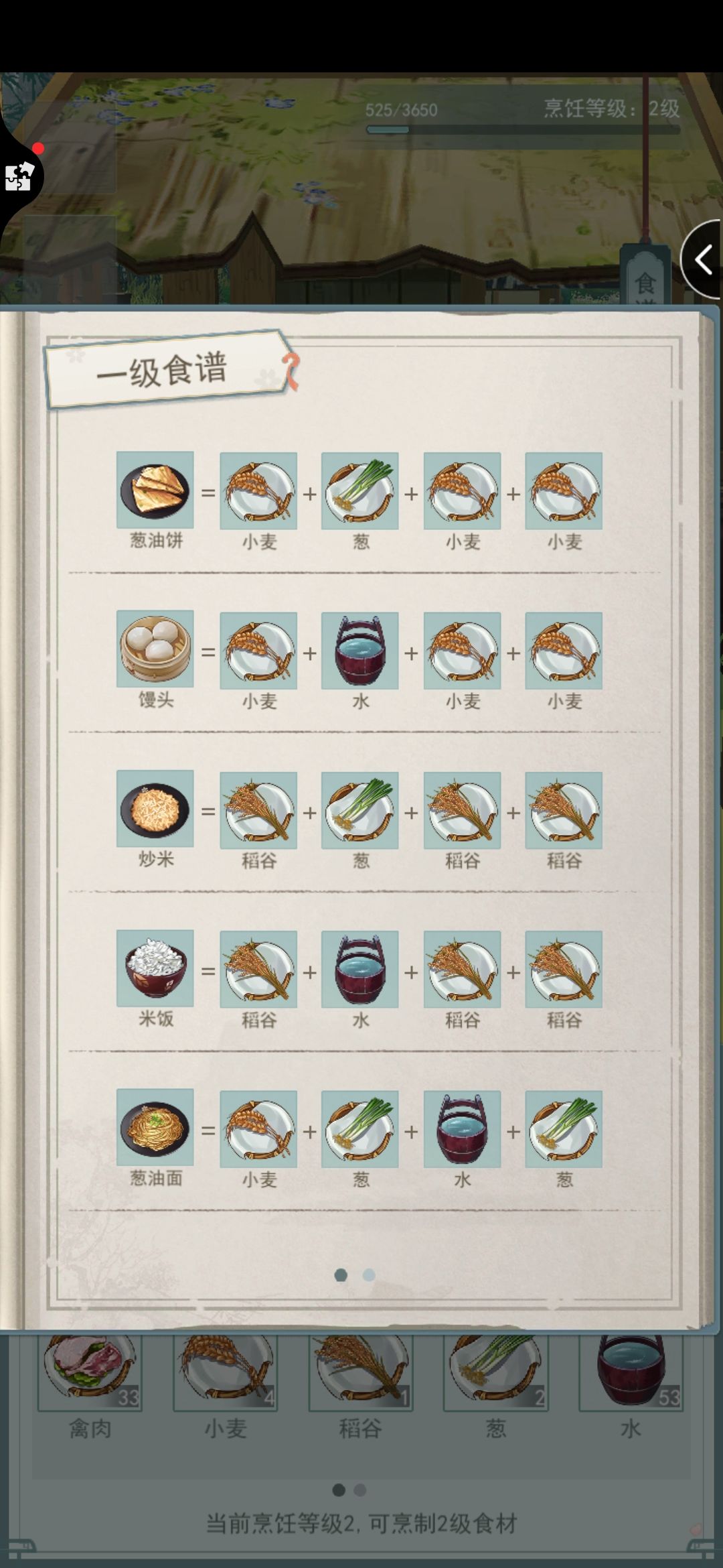 以一级食材/菜谱为例 : 构成: 小麦、稻谷(主材,素)+鸡蛋(主材,荤)+葱(配料)+水 【 一种食材 】 〖 4主材,素 〗 面团 = 4小麦 饭团 = 4稻谷 【 两种食材 】 〖 主材+水 〗 馒头 = 3小麦 + 水 米饭 = 3稻谷 + 水 粥 = 2稻谷 + 2水 稀饭 = 稻谷 + 3水 水煮蛋 = 鸡蛋 + 3水 鸡蛋羹 = 2鸡蛋 + 2水 〖 3主材+配料 〗 葱油饼 = 3