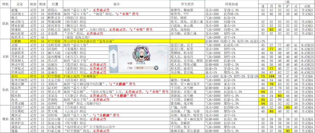 一、楼主吐槽 角色:17区-十方诸佛-魔天阁 吐槽:策划敢不敢再整点阴间玩意,300次我才抓到一只珍惜符灵???没硬保底的玩意,让玩家拿头去怼嘛。另外就是,通过抓全图鉴的个人感觉,抓珍惜灵兽和抓珍惜神兽的概率是差不多的。奉劝大家把赌脸的运气拿去抓神兽吧,而且神兽就算是普通的,属性也碾压珍惜灵兽。 关于灵兽如何选择、如何获取成本最低及培养的注意事项。。。等以后有心情了再补~ 二、全灵宠图鉴(含所在地