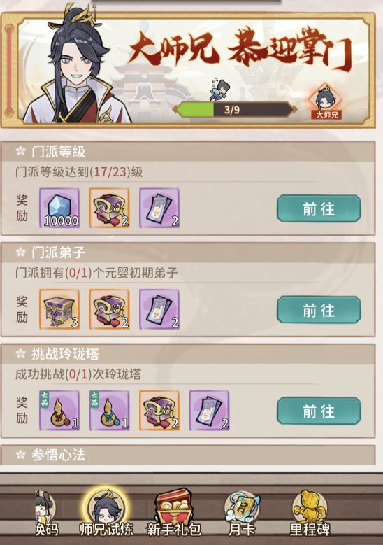 弟子选择 男掌门+司音,掌门+明月,掌门+伶珑,推荐度,掌门+司音。 掌门+司音开局有橙色词条选橙色,开图鉴优先选机缘,要弟子优先选气骨,没有橙色随意选择。选择开始人生选择 长生不死 悟性+1下山除妖 下山除妖 带头冲锋下山游览 坊市捡漏 机缘+2散修交易 过去看看 买下 反杀门派发布 没有伙伴就选择一个人清绞妖兽, 有伙伴选择斩杀大妖,妖王不打。拍卖会 参加,买下,身上最少1400以上。宗门人手