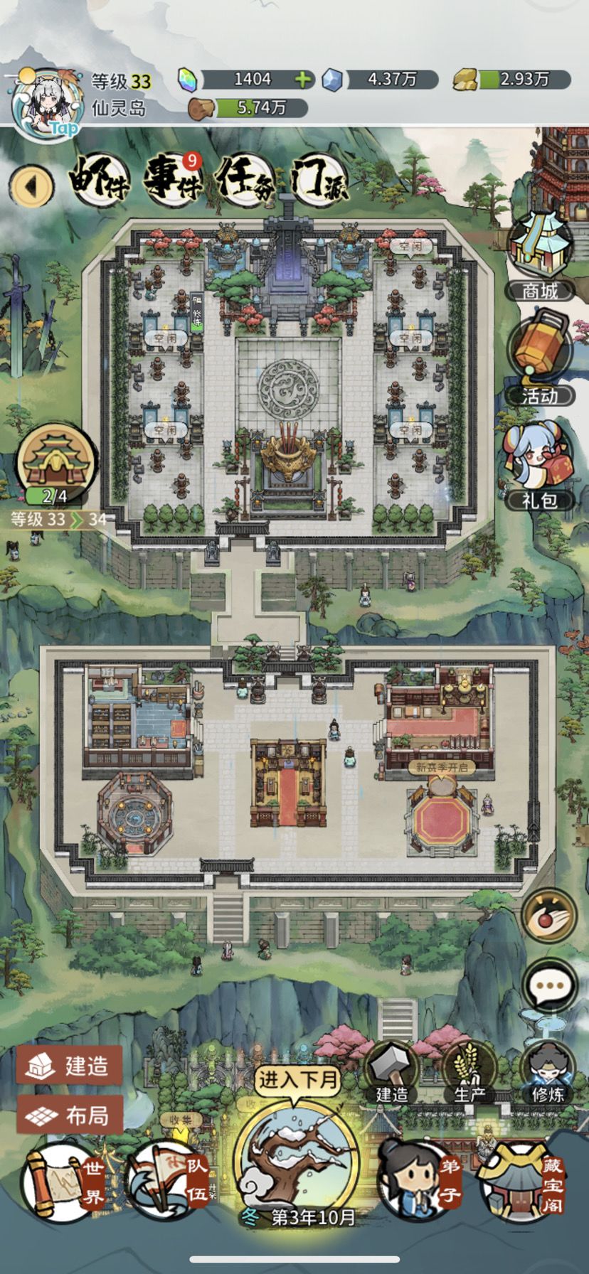 参考了很多dalao们的摆放,吸取dalao们的精华,耗时两天搞出了自己的~ 左边中间地方的布景先缓缓,大家可以自己加 右边丹狱地块全是布景,后面多了新的建筑可以放进去 农田留了一块给未来增加的建筑摆放 更新: 35级多了个耕地和厢房: 鼎移走,护山大阵放下去,掌门住处放过来,墓地移上去,刚好放多的厢房 耕地预留了位置,刚好