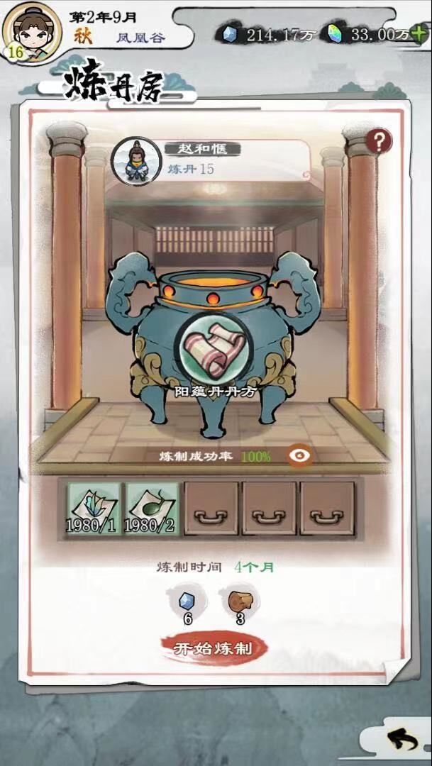 炼丹要求:1、一座丹炉 2、炼丹配方 3、拥有炼丹能力弟子 炼丹特点:1、越高级的丹炉越好 2、炼丹配方3、高品阶的丹药需要高级炼丹师 难度:3颗星 难度讲解:炼丹配方获取有两种方式:1、藏书阁 2、弟子在野外探索获得 3高级炼丹师(弟子)培养较为困难 收益:中等 炼丹房是门派中炼制丹药的建筑,炼丹首先需要对应的丹方,当拥有丹方后再加入相应的炼丹材料,派遣拥有炼丹能力的弟子进行炼制,当炼制高品阶的
