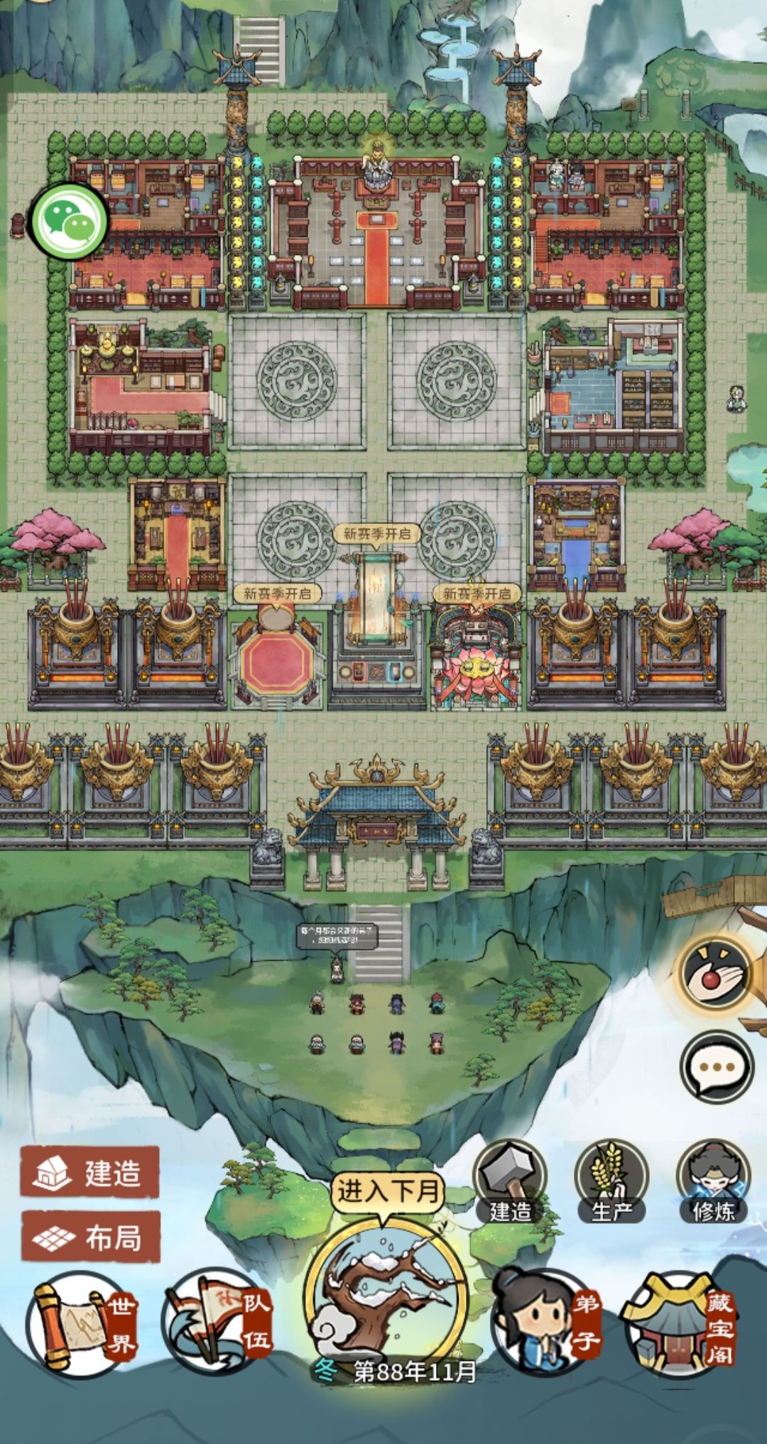 1.祖师殿,门派核心大殿区,演武场。 2.休息区,掌门,弟子休息区。 3.修行区,弟子打桩,秘境锻炼区(秘境区等建完最后一个再重新美化一下)。 4.打工区,苦力弟子后山劳作区。 5.功能区,提升战力功能区。