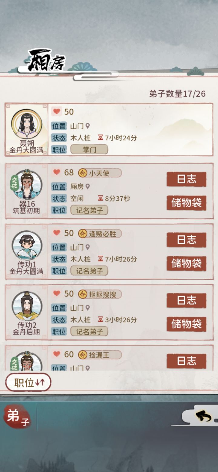 今天浅谈下工具人的养成方法。拿炼器,制衣,巧匠为例。首先要知道:炼器:是做所有武器制衣:是做衣服,鞋子,腰带巧匠:是做戒指,项链,帽子,护腕材料+制作等级,决定了你的成品好坏程度还有最重要的一点,就是境界!!!拿炼虚装备举例,你的制作角色得达到元婴境界,才能去锻造炼虚的装备,化神装备需要弟子是金丹境界。那么,有些玩家把掌门和大师兄选择炼器,制衣,巧匠的,那就无所谓的,你的境界肯定