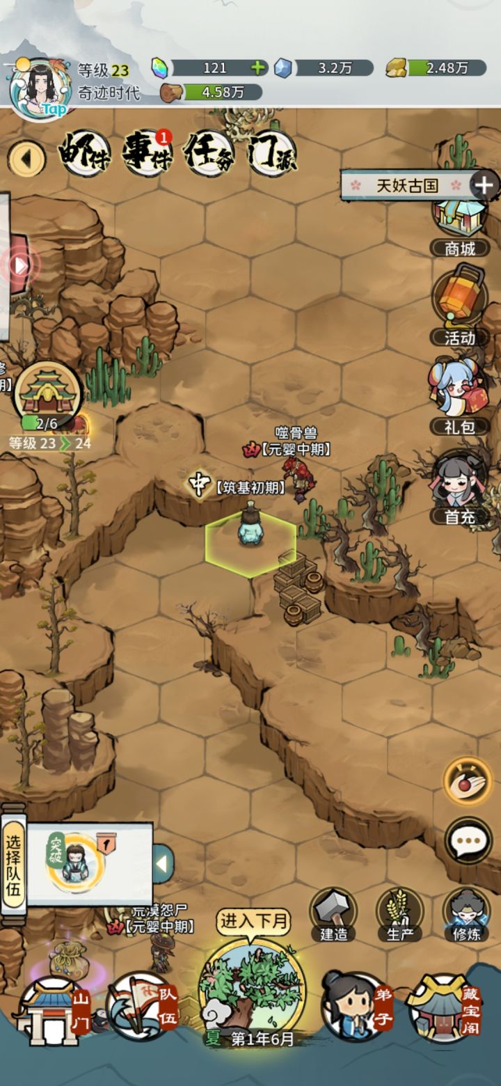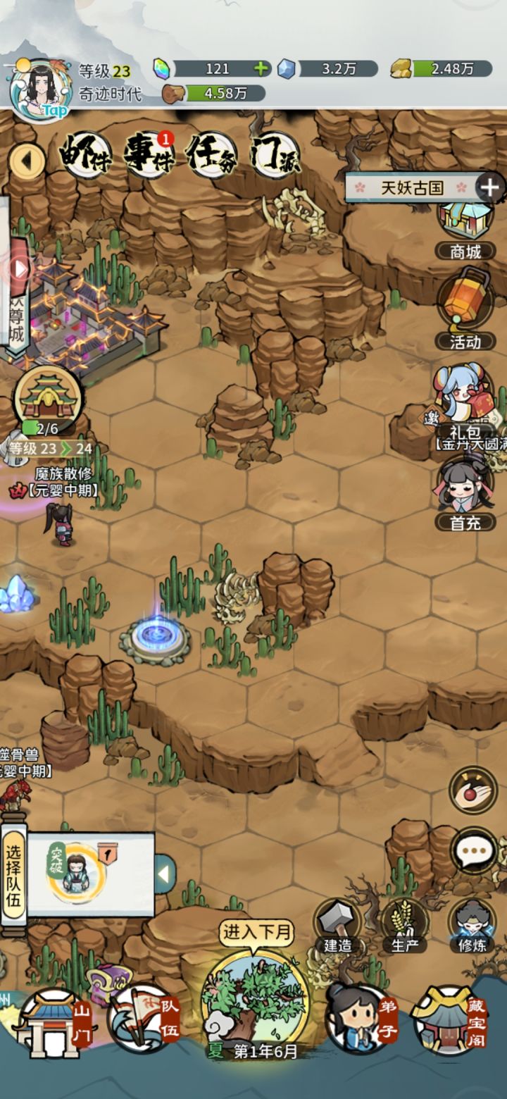 新手第一天可以金丹后期 然后到天妖的主要的条件是先清蝎子旁边的4只怪 也就要求主角和小师妹需带枪类武器 (蝎子7w+战力可过)我的主角选的是武灵 刷了器15(地图上有器+1 目前器16) 目前金丹大圆满 大师兄准备选丹+阵或者丹+武道天妖之后 有元婴中期的怪会卡你 但不重要 选主城跳到妖尊城 那边的怪能清一些 能多拿一些经验 争取快速到达元婴 游戏也就刚刚开始了