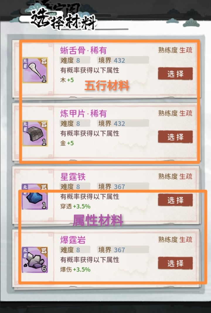 1.炼器,我们萌新习惯性的点一键,省心,但是你不知道的是,这个是可以控制出货的,怎么控制?说白了就是每次需要的材料只有五行材料决定武器类型(是啥先去藏书阁看),结论就是你先放你需要的五行材料一个,剩余的放加属性的或者放高境界的同属性五行材料和稀有的五行材料,但是别放不同类五行材料!那这个武器就必出你需要的!而不是别人说的第一个放你需要的后面无所谓!是不是可以自己实践武器制作出来的品质和你添加材料