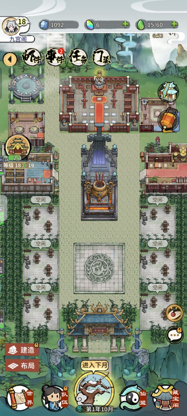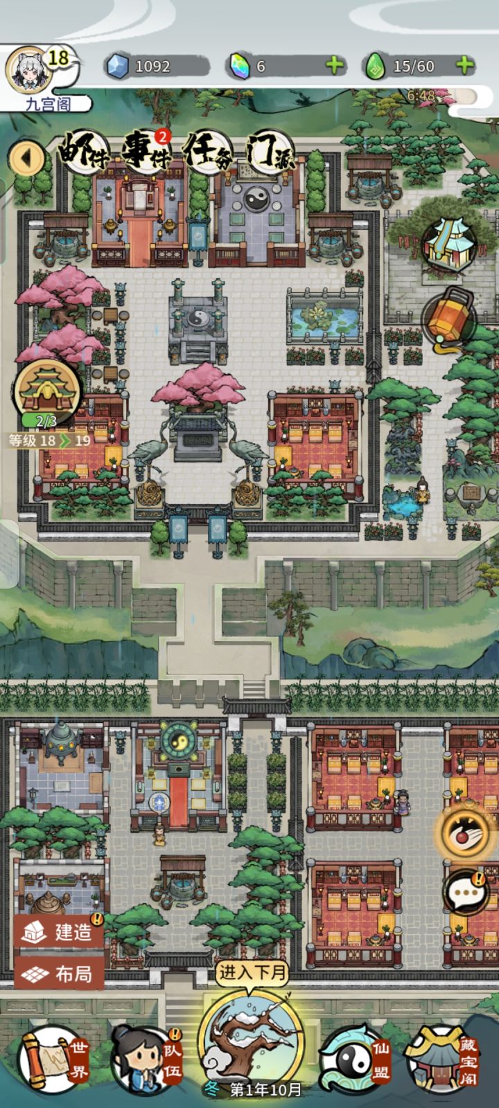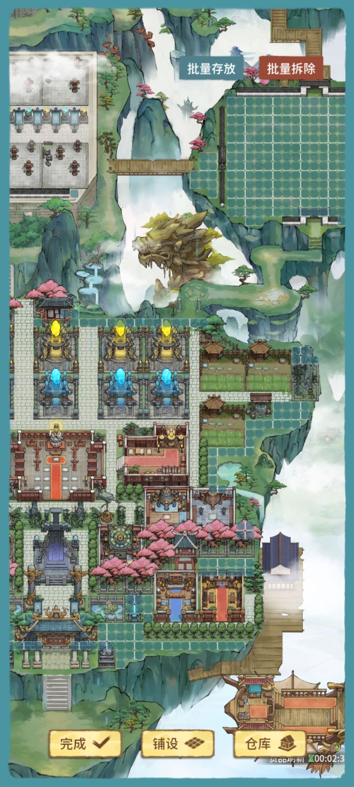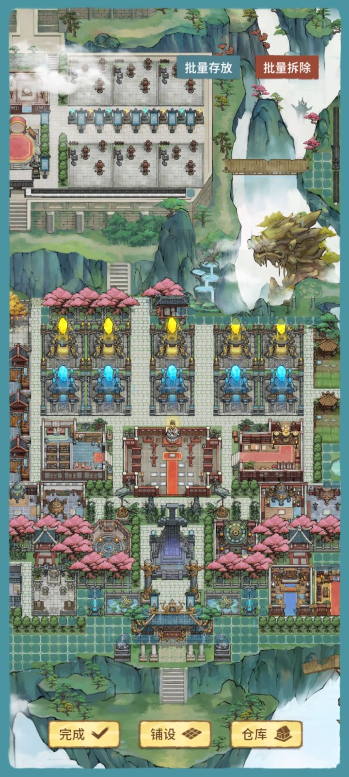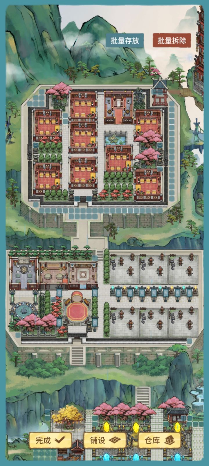 发个三十三级布局右上角我把试炼的地方全部放在那里了,玲珑塔丹狱还有秘境啥的。算是一个门派禁地比较神秘。它的左边两块地方,上面全部是住的厢房,下面是练功的地方,包括木人桩,突破的地方,修炼心法,参悟心法,传功和比武台。总之这块区域就是提升自己的地方。最后下面的主地,因为我比较喜欢对称一点点,所以我保留了系统最开始放置大殿、藏宝阁那三座建筑的位置。这三个建筑我就感觉应该在一起其他几个地方太小了放不下,所以我就没动。然后我把炼丹炼器制衣制饰品和这些收益装置都放在了一起,主要是因为这些东西是我们点击的最频繁的。放在中间不用移动屏幕去找比较方便。基本上算是分区比较合理我觉得。
