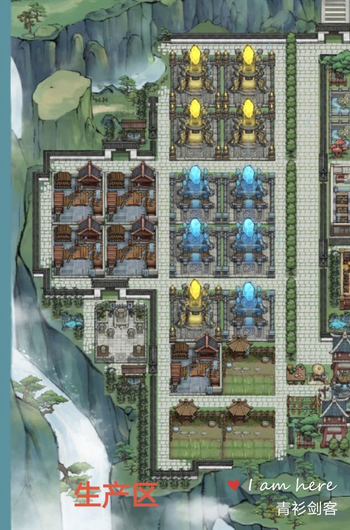 各版块合理运用,该放的建筑都放了。生产区合理:下面有四个单独的(伐木,灵石,金矿,药园)摆放在一起方便收菜。住宿区:基本不去,没啥功能,偶尔观赏一下。练功区:6个木桩不多说,弟子呆的时间最久的地方。挑战+制造区:挑战,爬塔都在一起,制造的药,装备,也都在一起,方便点,不用滑来滑去。主城区:就这样,喜欢就拿去吧~😝😝0氪至今,化神后期,地图全开了,玩的还是挺开心,前期爽度不错,游戏还需