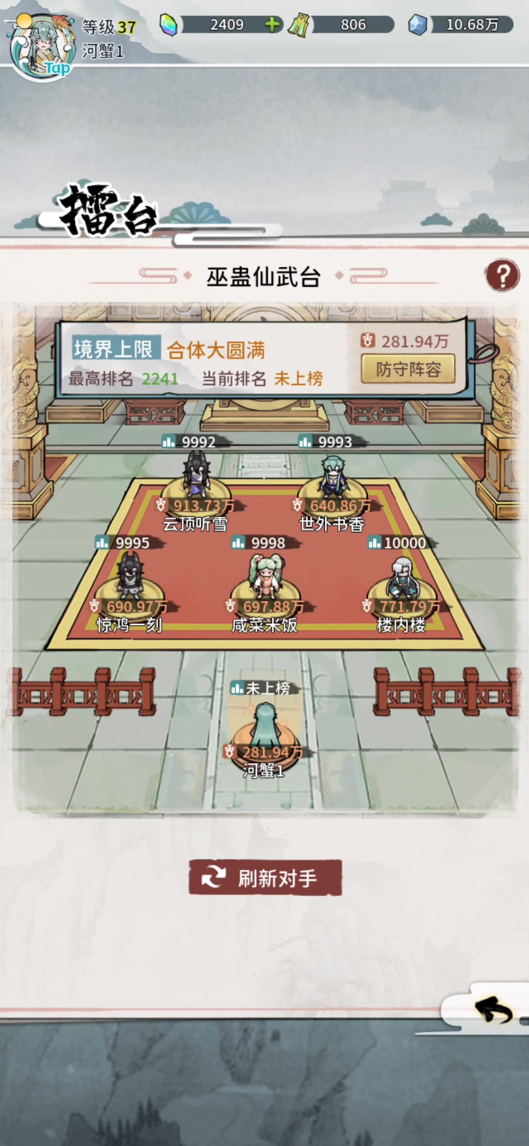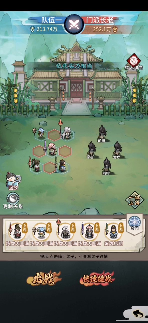 我37级,全员练虚中期,战斗力总计137w,合体渡劫石万像石秒过!但是!!但是😅,这个练虚的藏宝图我打不过哇~有大佬给给意见嘛或者方法嘛 我的对于没带鼎,有印,有枪,刀少。主要是敌人攻击力太高,两招秒我前排。以我的目前的这个情况来看,合体之后才能打。😛