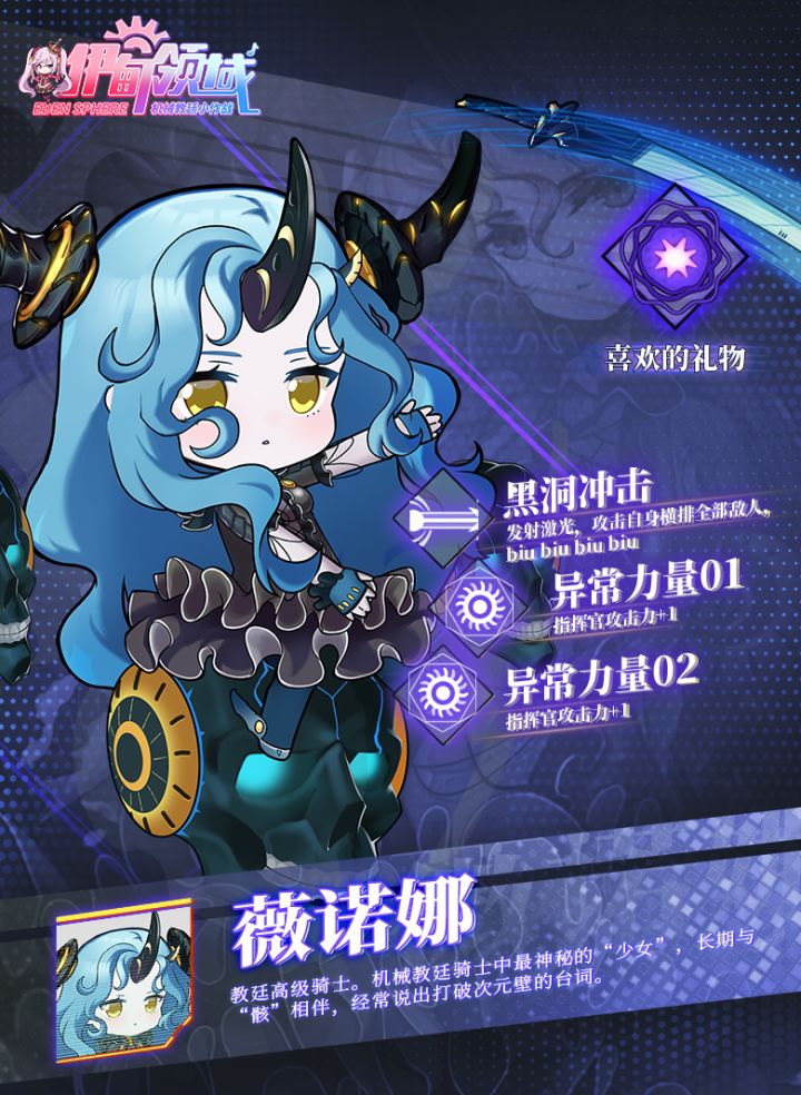 薇诺娜——教廷高级骑士。机械教廷骑士中最神秘的“少女”,长期与“骸”相伴,经常说出打破次元壁的台词。她性格古灵精怪,因为能与机械灵交流的能力常常会自言自语,天生具有收集亡灵并与之沟通的能力。每当一场惨烈的战斗结束,薇诺娜便如太古传说中的女武神般游走于战场上,挑选猛士的灵魂,在得到灵魂同意的情况下,将这些勇猛的英灵存入漂浮在她身侧的机械头骨口中。”你问是否寂寞?如果你可怜我,你愿意现在就成为我的