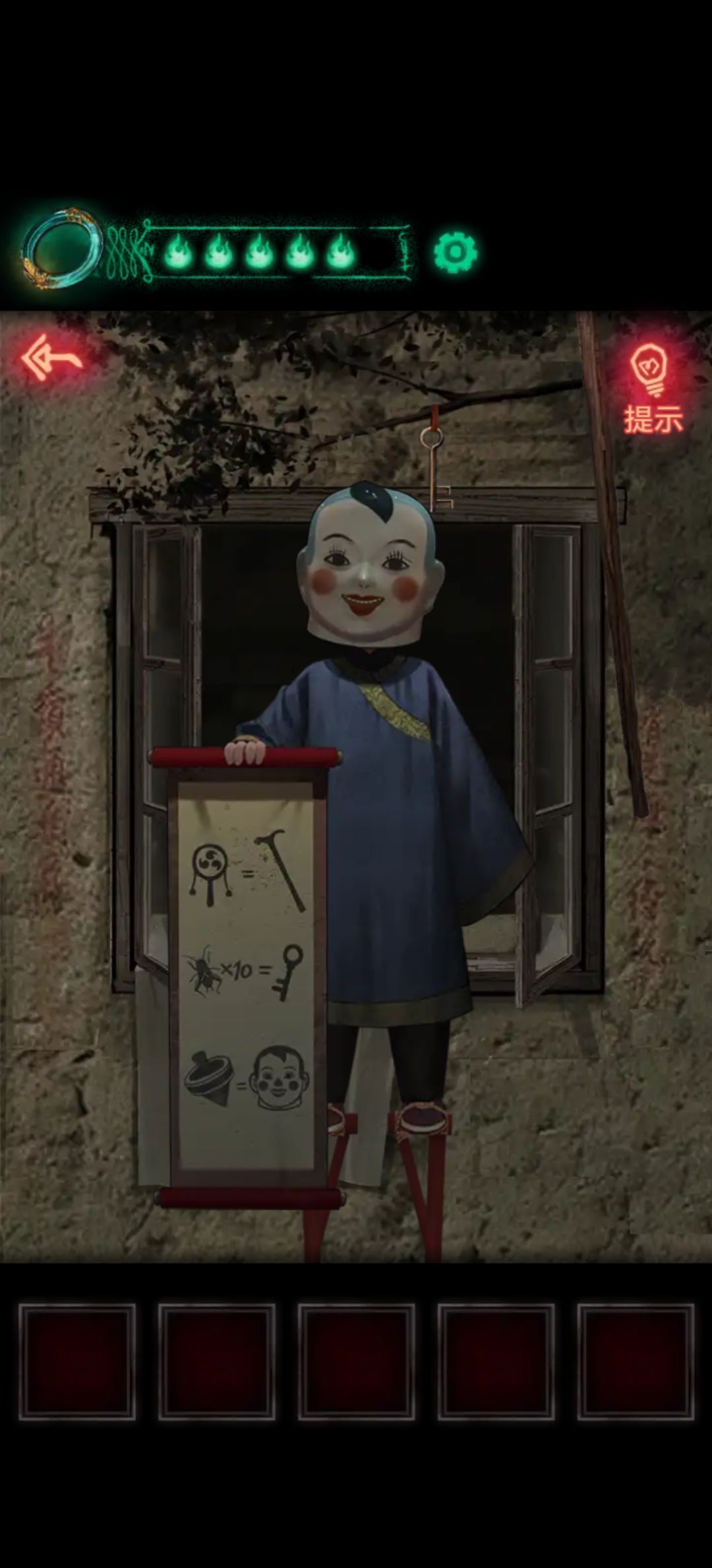 剧情过后先看右边,提示是死过人的天干年份在上排而且按照死者数量从高到低排列,真有拿自己先人当机关的么→ →。 之后往右边走和头套小孩对个话获得拨浪鼓=拐杖,10只蟋蟀=钥匙,陀螺=头套的线索,要做的就是找到前面这些东西,而且要记得这个等式后续还有用。 点右下角草丛里面有蟋蟀提示没有容器装,点门提示门被锁住了,找钥匙也就是找10只蟋蟀,所以最终还是要找容器。 再切回老太太场景走左边路来到河边,点河