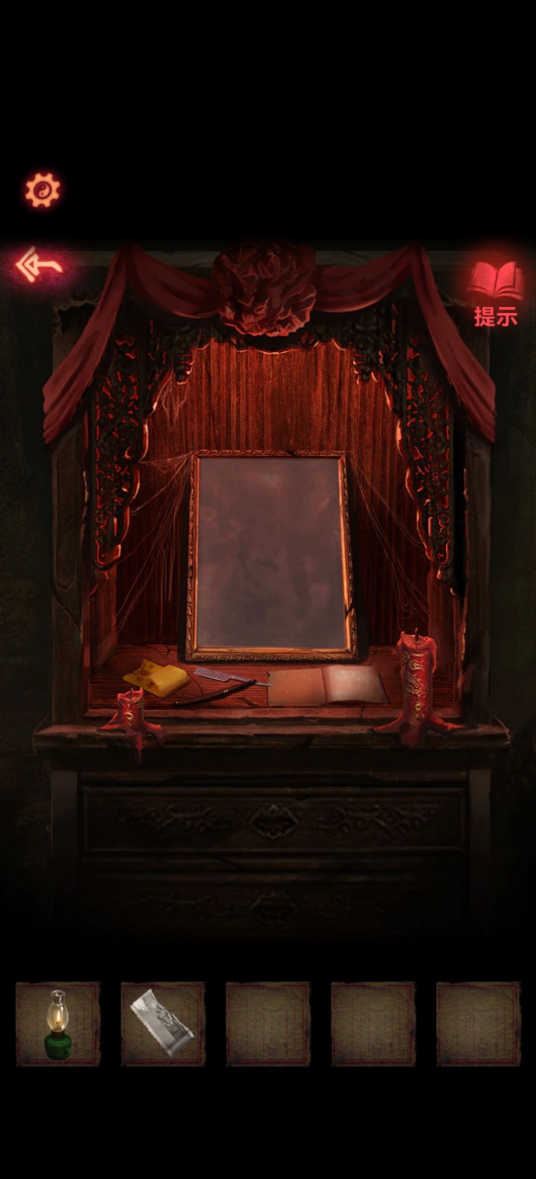 首先过剧情,按照提示点点点的部分就不多说了,被关起来后开始解密~首先自然是掀开红盖头受惊吓......然而并没有,镜子里什么都没有。 先检查梳妆台左下角柜子上面画作,1是纸新娘,2是大树,3是月亮,4是佛像,旁边锁输入开一下拿到一块枣糕。 切一下场景从梯子最上面拿到煤炭,然后拉走白布就可以用梯子了。 从脸盆拿到湿日记本,因为是湿的暂时不能看,要想办法烘干,旁边就有灶台,盖上盖子准备点火。 把梯子挪
