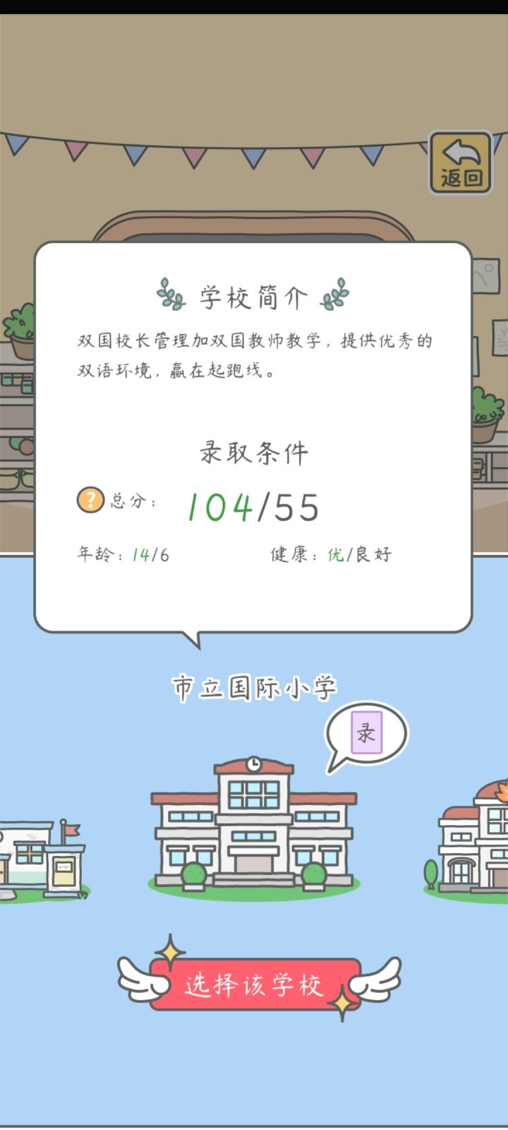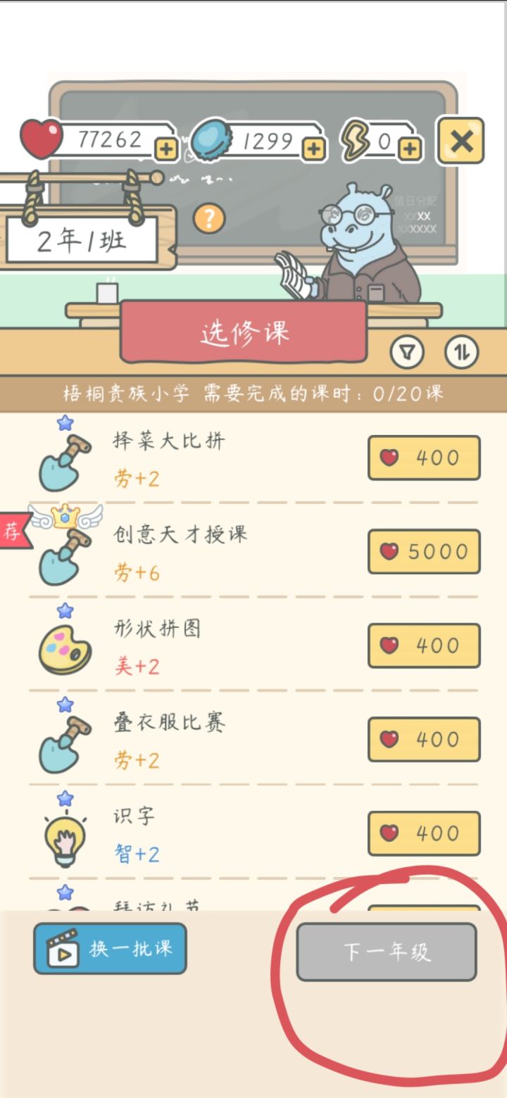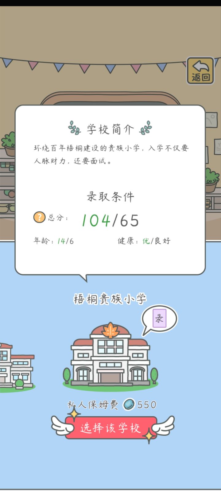 2.小学读梧桐贵族小学,入学没花钱(保姆费要550瓶盖,但是我和另一玩家没有被扣,其他玩家反映被扣了,不知道是不是bug,大家酌情考虑),课程有+2+3+4+5+6,价格是400-800-1500-3000-5000,升学条件自己看“下一年级”哈