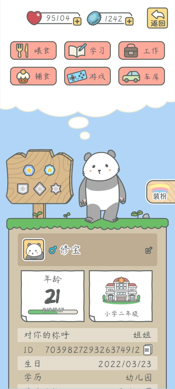 ps.后三张是2022.3.30的截图,可以看到剩的欢乐果和瓶盖,瓶盖的开销主要是:一整套家具(最便宜的)+解锁一个餐位50+背带裤+每天买课程花100瓶盖+上幼儿园200