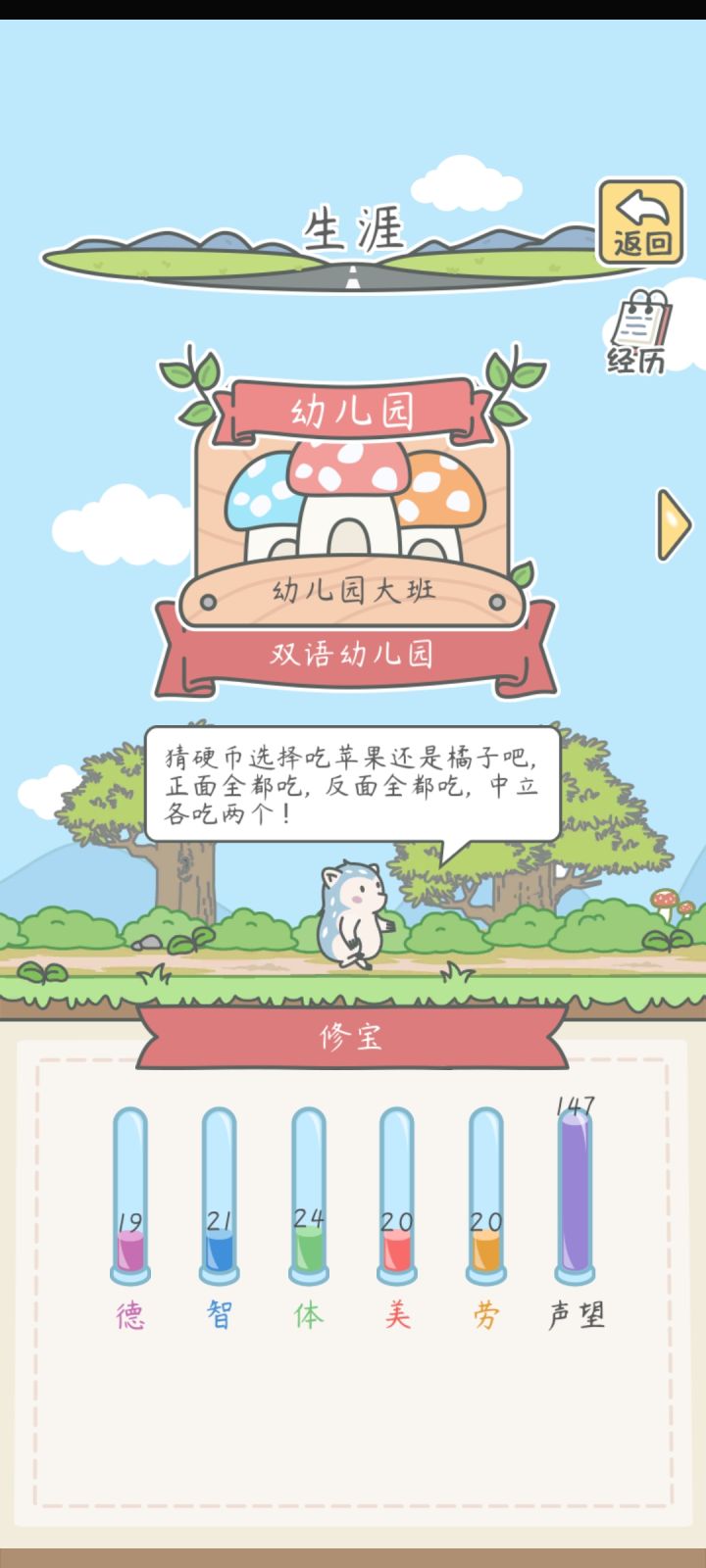 1.幼儿园读双语幼儿园,入学交200瓶盖,课程有+1+2+3+4,价格分别是100/200/400/800欢乐果,小班升中班是德智体美劳都要3,中班升大班是5(可能会记错,或者官方更改数据,可以点击“下一年级”看升学条件)。