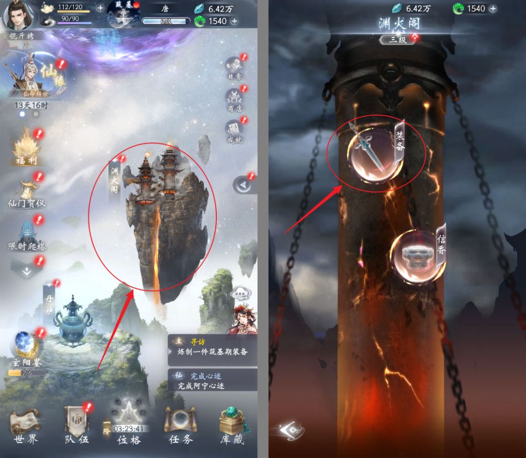 #游戏攻略 首先在宗门场景,点击渊火阁入口,进入渊火阁场景。 进入渊火阁后,选择信香,选择配方。 消耗对应的材料后,即可调制信香。