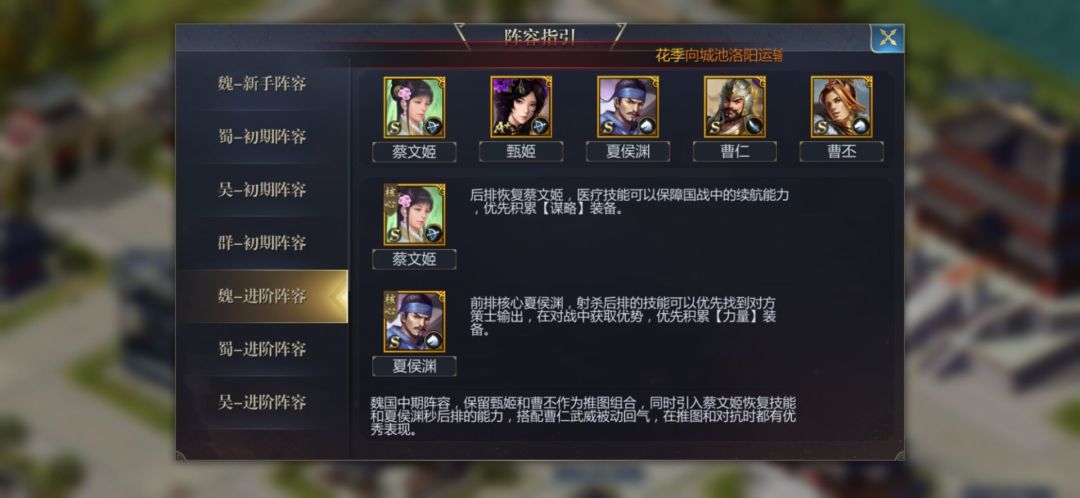 1.零氪前期不建议养s+,升阶困难 2.想好玩的阵容,零氪建议魏国,V3可以吴国,群雄v8可以玩,蜀国前期不行 3.魏国阵容以甄姬文姬曹仁为核心,这里建议蔡文姬的智谋大于甄姫一点,另外两个用荀攸和曹丕,吴国国家队主力培养太史慈孙坚小乔,另外两个用大乔孙策或孙尚香。群雄阵容吕布华佗左慈为核心 4.装备可以在荣商店換,装备提升战力大于人物升阶前期。主力尽量a+开场,其次要有一套紫色最好是跟核心同职业的