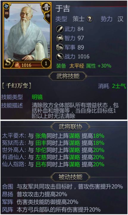 大众搭配群的顶配阵容,吕布+左慈+董卓+貂蝉+华佗。 其实顶配到后期华佗回血技能用不上的,不如搭配于吉技能[明镜]。 · 2气瞬间清楚敌方所有增益状态,无敌、回血、技防、增强等。 · 于吉对蜀国前排碾压式克制,刘备、张飞、赵云、姜维、庞统,彤彤无效。 · 于吉对于魏国普攻绝对克制,貂蝉、董卓会被郭嘉清除,但有于吉张辽、曹操、荀彧,技能都没用。 · 对于吴国来说,大乔不能补血,孙权不能双倍。 如果非
