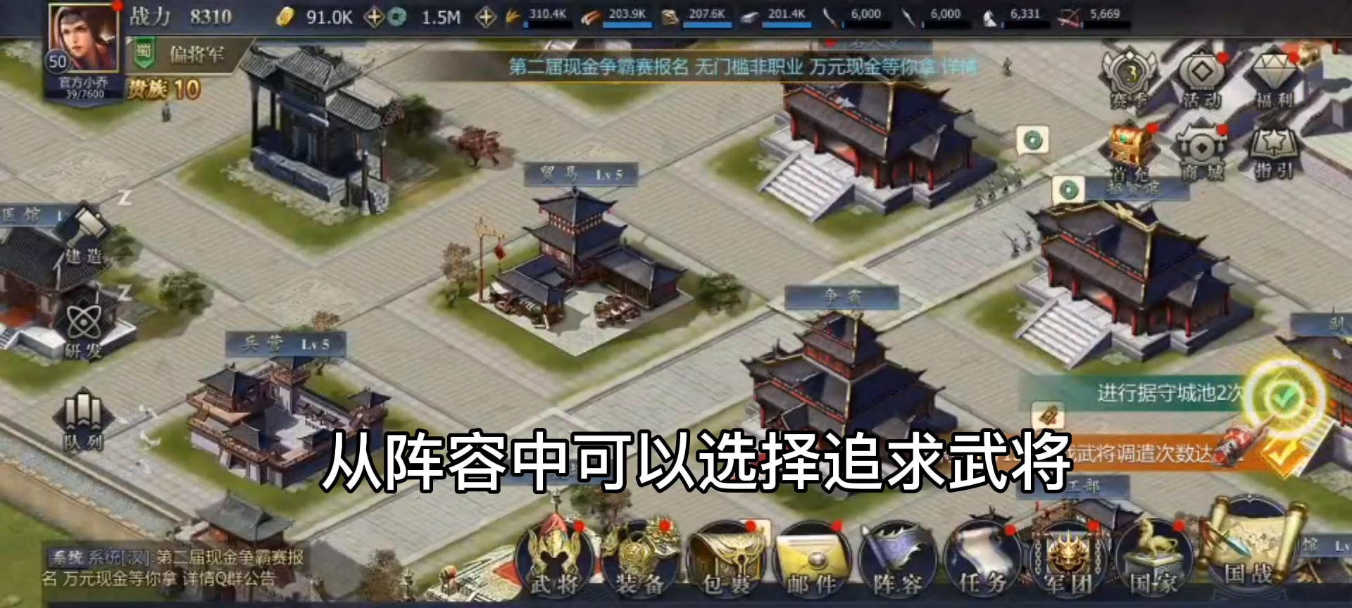 国战积分决定每日获取奖励的基础值,主要获得金锭、武勋、军团币、粮草、声望等重要资源 关键词:别丢城,防守为先,优先占领本势力区域城池,外加努力完成任务城池 最简单获得:杀敌、剿匪、打劫积分可优先完成 千万别丢城、别丢城、别丢城重要的事情说三遍,丢城会损失大量积分,导致功亏一篑,甚至积分变复 占领的城池越多,获得的总积分会有一定衰减 攻占昨日未占领的城池会获得攻城积分,与占领积分一样,攻下的越多积分