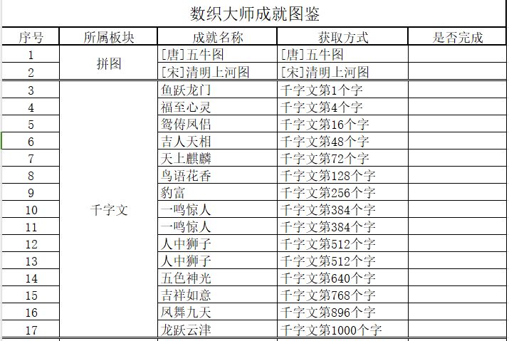 ■成就相关(括号内是成就数量) □数织完成练习册(5)、百家姓(52)、三字经(17)、千字文(15)全部关卡。 □拼图完成五牛图、清明上河图。 □5+52+17+15+2=91个,很多都是隐藏成就,追求本作全成就需要一定耐心,单清明上河图一个成就就要拼100关图,其他关卡共计两千多关。 #发现好游戏 #游戏攻略 #成就党