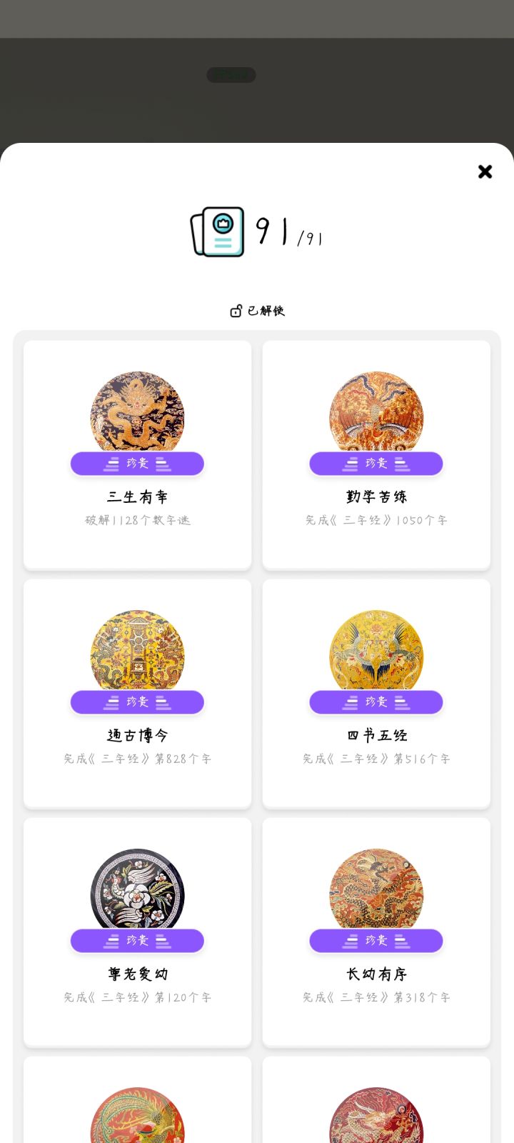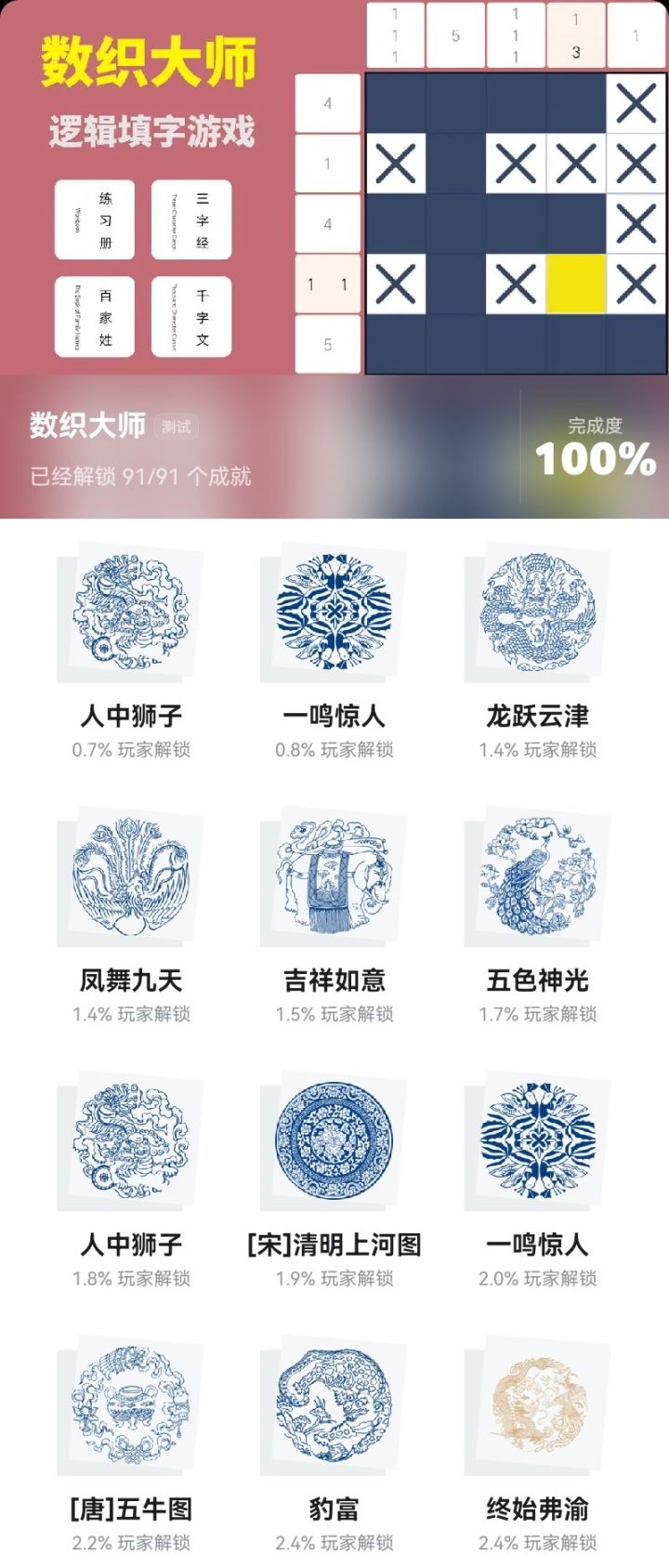 ■成就相关(括号内是成就数量)□数织完成练习册(5)、百家姓(52)、三字经(17)、千字文(15)全部关卡。□拼图完成五牛图、清明上河图。□5+52+17+15+2=91个,很多都是隐藏成就,追求本作全成就需要一定耐心,单清明上河图一个成就就要拼100关图,其他关卡共计两千多关。#发现好游戏 #游戏攻略 #成就党