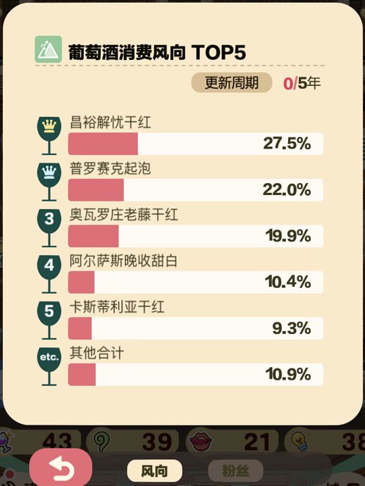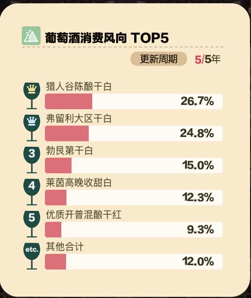 亲爱的小伙伴们大家好呀!作为酒庄管家,每年选择酿什么酒可是个大学问,毕竟我们的时间就那么多,立项到酒装瓶足足需要接近半年的时间呢,而如何选择酿什么酒呢?这里面可大有学问,且听经验丰富的管家给各位庄园主支招。1、选择时下销量靠前的酒商场不是一成不变的,人们的品味也在不断变化,也许今年卖的最好的酒,到明年就没什么人喜欢了,所以紧跟市场变化尤为重要。每过五年,市场上就会出现关于葡萄酒的销量统计,计