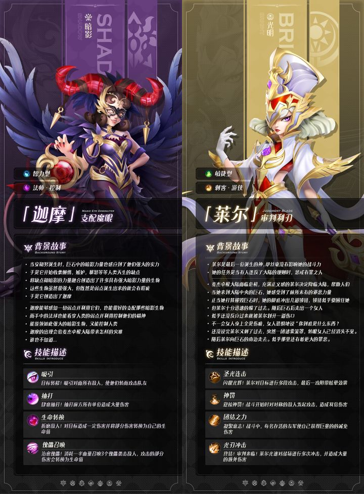 自古以来,光明与黑暗就一直存在于这片大陆之上黑暗从光明中诞生,而光明又因黑暗而更加明亮,但双方的斗争总是不会停止迦摩·支配魔眼,希望通过暗影的力量,洞悉生命的弱点,控制他们的精神莱尔·审判利刃,则凭借极强的敏捷和力量,惩戒罪恶她们各自为所在的势力效命,光与暗的大战一触即发,而大陆上的其他生命将如何选择......PS:各位领主在游戏之中的某个地方能看到她们的身影哦~ 敬请期待~