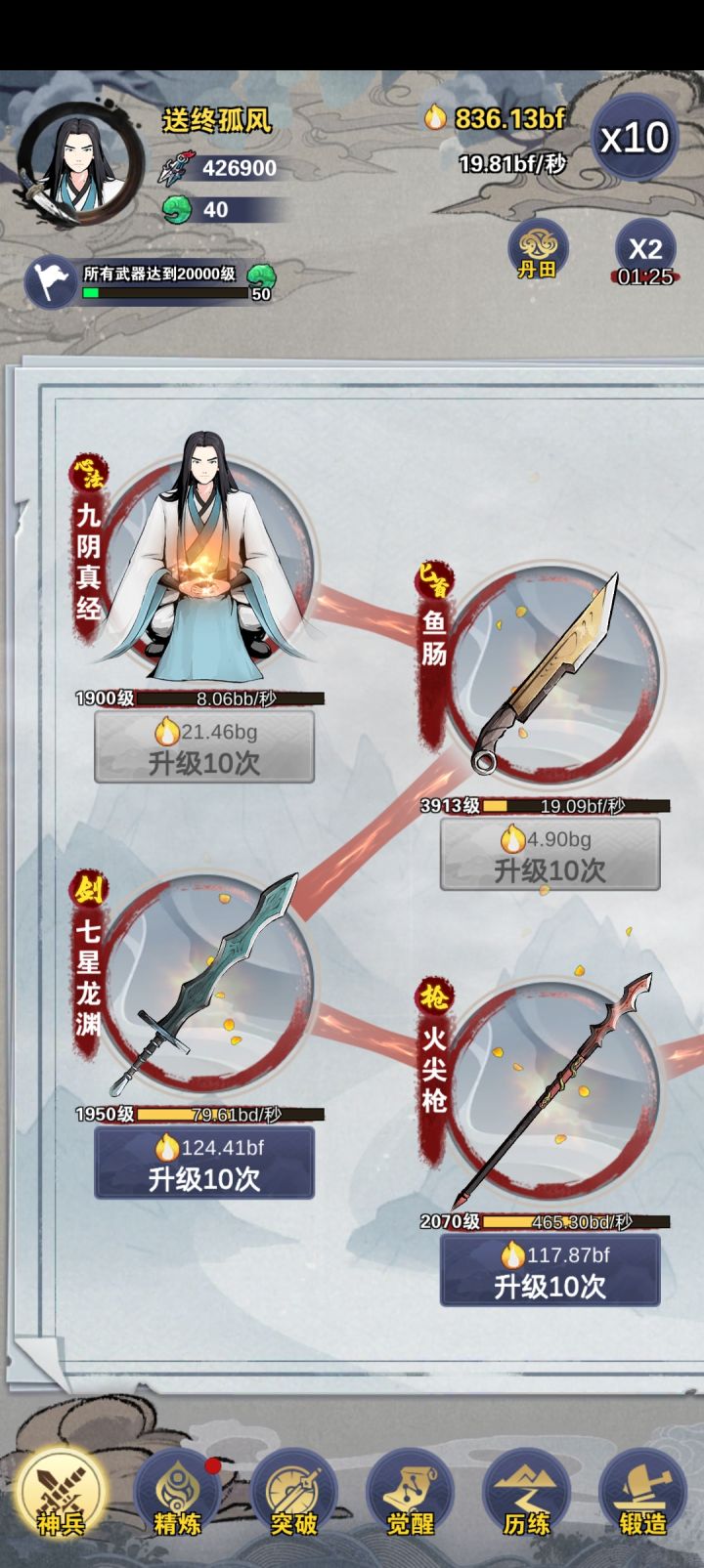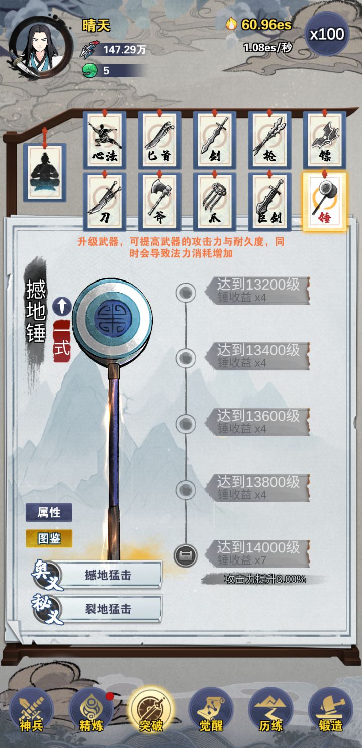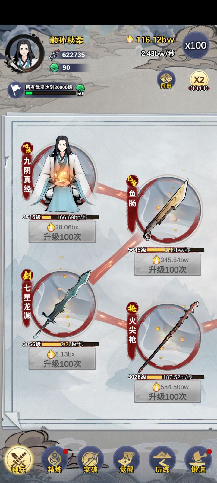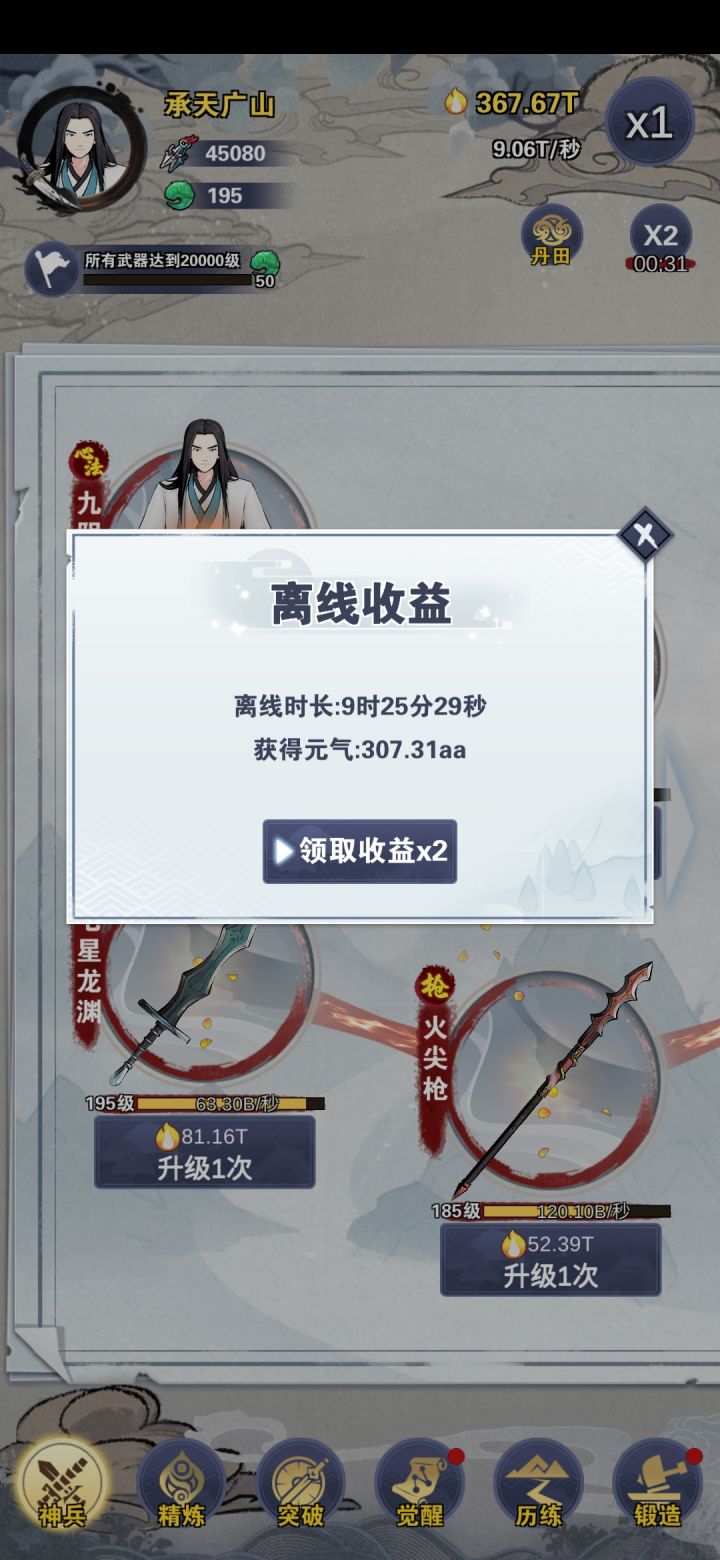 已通关,武器打磨优先打磨匕首和锤子,可以加一个飞镖。全打磨完前,每个武器只打磨一次,加倍buff只有一次,不叠加。全90分以上很容易。然后再追求完美。离线经验不要看广告,会变没。觉醒时间到了就点。经验基本靠锤子,中期有段时间靠匕首,后期还是锤子。