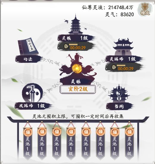 洞府系统是较多萌新道友容易忽视的玩法,因为玩法实在过于简单。但洞府产出的各项资源可是渡劫、强化本身、提升境界的必备资源,所有产出资源都是硬通货。洞府玩法有灵脉、功法、灵根、灵阵师、战阵师、书阁、灵池,共七个小玩法,每个玩法产出的资源,可供角色各个成长分支提供所需材料。一、灵脉灵脉升级需要消耗仙尊灵液,分为黄阶、玄阶、地阶、天阶,升级灵脉等级可以提升主角的境界品质,强化提升主角各项基础数值。灵