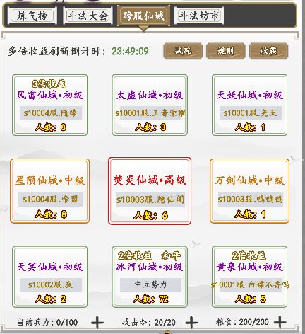 跨服仙城玩法是一个可以产出大量仙缘资源的地方,仙缘的重要性就不多说了,在游戏内发展的时候总是需要用到仙缘资源,特别是有抽奖和消费类的活动时,消耗是比较多的,所以说这个玩法非常重要,每天可以产出比较可观的仙缘资源,所以很多玩家每天都会来参与这个玩法,抢占位置。在跨服仙城内总共有九个不同的仙城,这些仙城都是有等级之分的,在游戏中,这个仙城争夺玩法总共有一个高级的大陆还有两个中级的大陆,其余的大陆都是