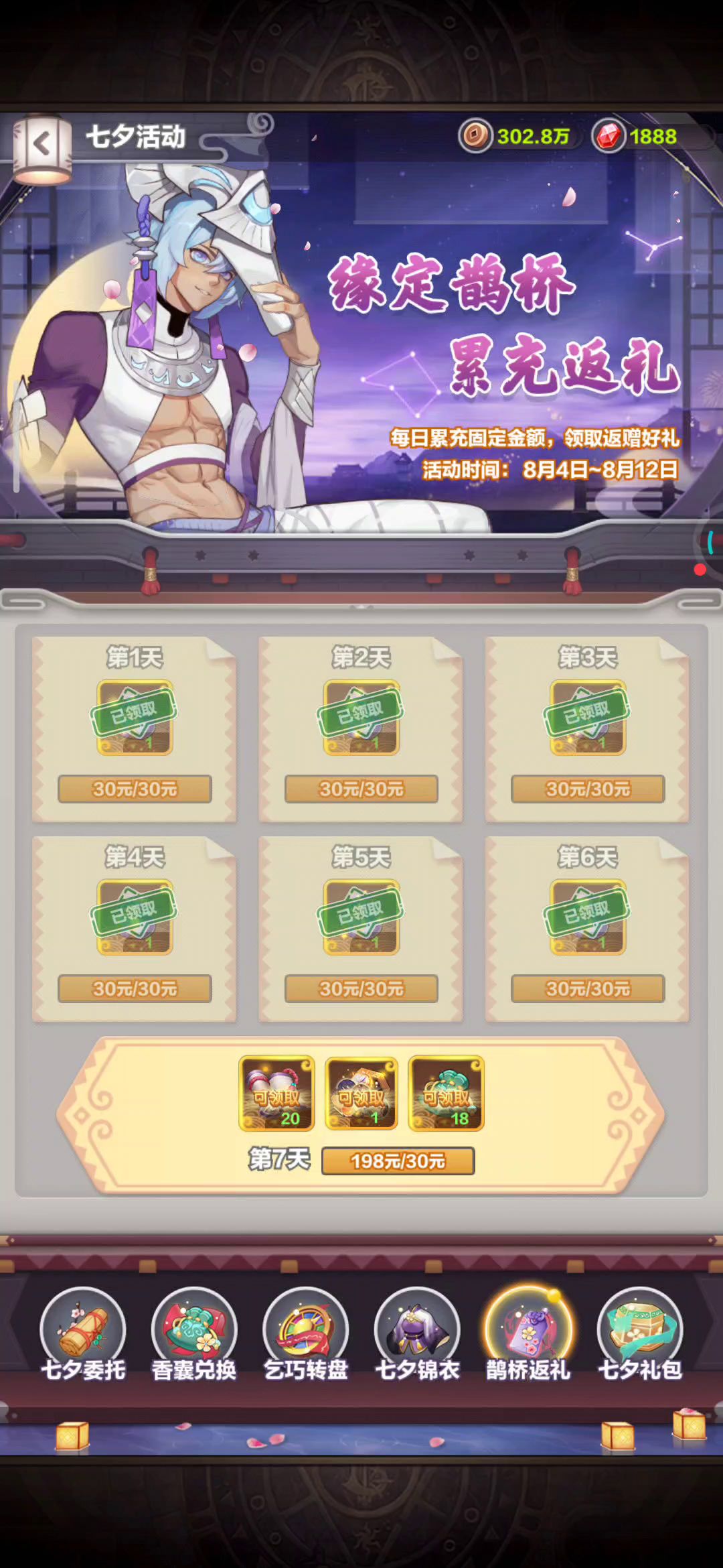 感谢星主大大的反馈~,关于七夕活动第七日奖励无法领取的问题将于今日(8月10日)14点更新修复,建议星主大大等更新之后再试试~后续有任何问题也可直接加入咱们的官方Q群:853165774或联系盛天客服: 点击打开微信小程序-联系客服进行反馈哟~