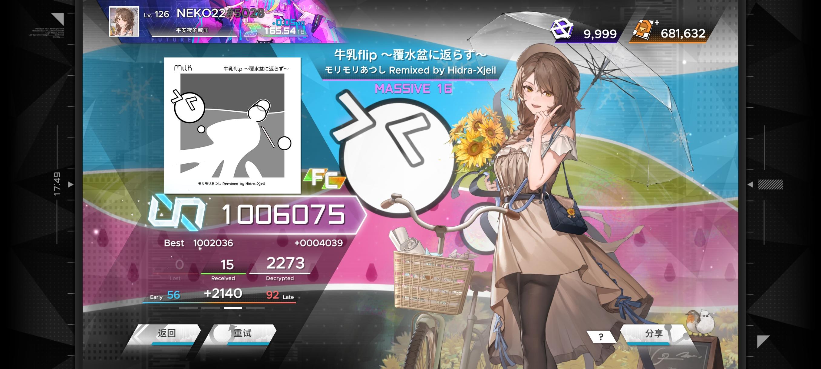浅算一下,上次玩还在8月份,现在玩范已经其中隔了4个月,但这次V4.0不仅爽吃chapter5 part1而且能把之前四个月中的两首免费单曲吃了,再加上新段位的曲子与等级曲,合计也能玩个7首+的新曲,零氪党也的吃范!这次葬送歌的RBT难度无疑是原MSV难度的底力位移加强,体感在16.3~16.4左右了,大概5pc吃下INF评,属于是小小复键了,明