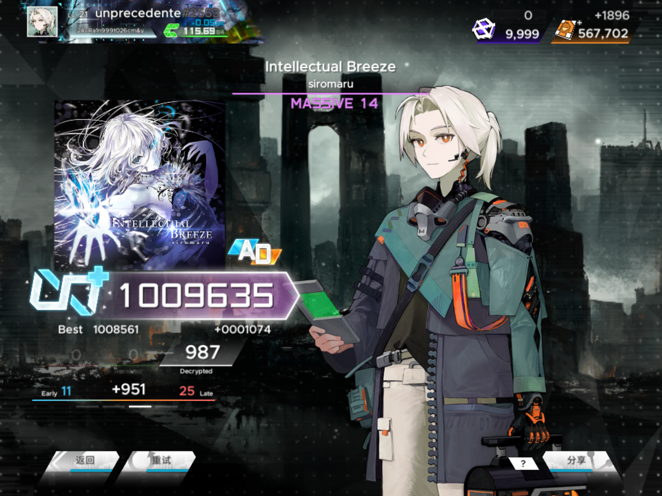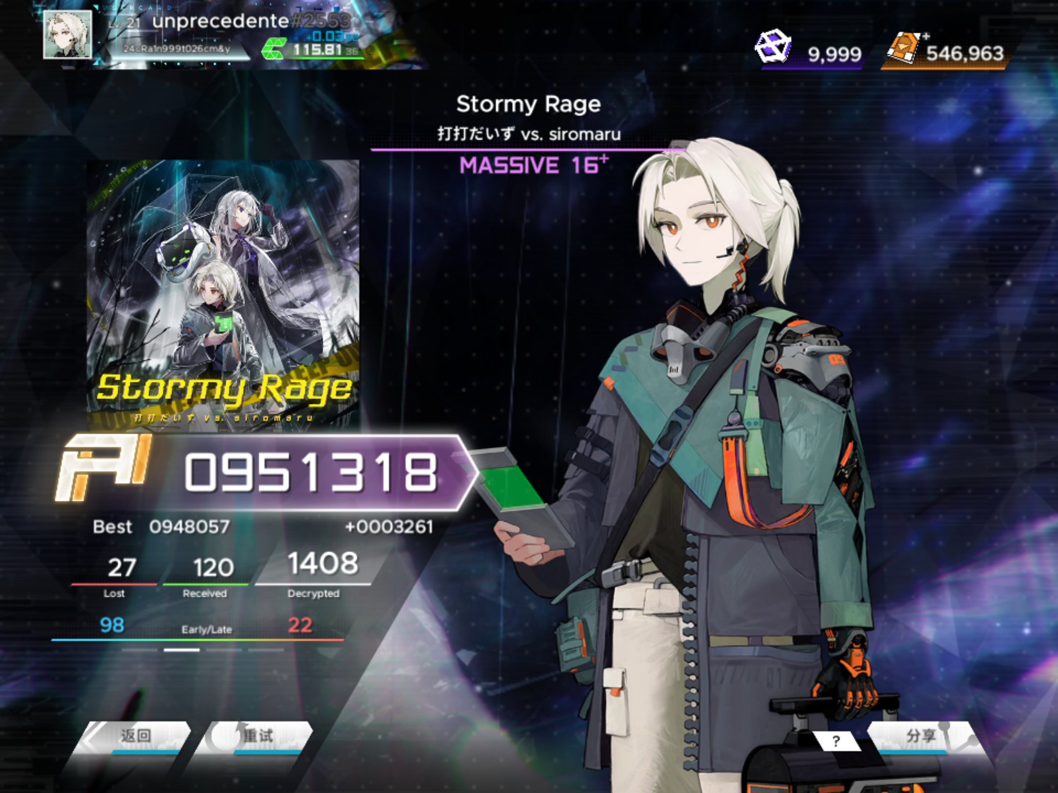 浅算一下,上次玩还在8月份,现在玩范已经其中隔了4个月,但这次V4.0不仅爽吃chapter5 part1而且能把之前四个月中的两首免费单曲吃了,再加上新段位的曲子与等级曲,合计也能玩个7首+的新曲,零氪党也的吃范!这次葬送歌的RBT难度无疑是原MSV难度的底力位移加强,体感在16.3~16.4左右了,大概5pc吃下INF评,属于是小小复键了,明