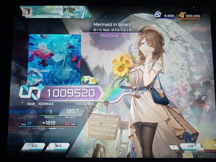 最突破极限的一击,开头的时候时被大佬的准度给吓哭了,这位大佬前半段几乎就没报几个小p,自己开头又自己爆了一个面对上这首并不算简单的15,当初我都快感觉绝望了😱🤯没想到后面不知道爆发了什么被动天赋😰😰😰后面准度直接飞起,一个都没爆😨可能对面这张谱子也打的不多,或是有点紧张所以报了一点,导致我后来乘胜追击,直接把这个给鸟加了?!(又是被自己吓哭