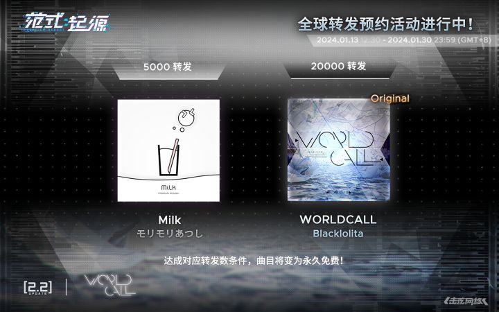 让大家久等了,我们的转发活动追加奖励方案现已推出!即使所有奖励都已经解锁,在我们讨论的这段时间内,大家的热情依然不减,截至本动态发布之时,全平台转发量已经突破5000!为此,我们将在国服上线时为大家直接免费奉上一首经典曲目:- "MilK" by モリモリあつし与此同时,转发活动将继续开展!在活动结束之前,两条动态所有平台的转发数总和达到20000时,我们将为大家赠以Blackloli